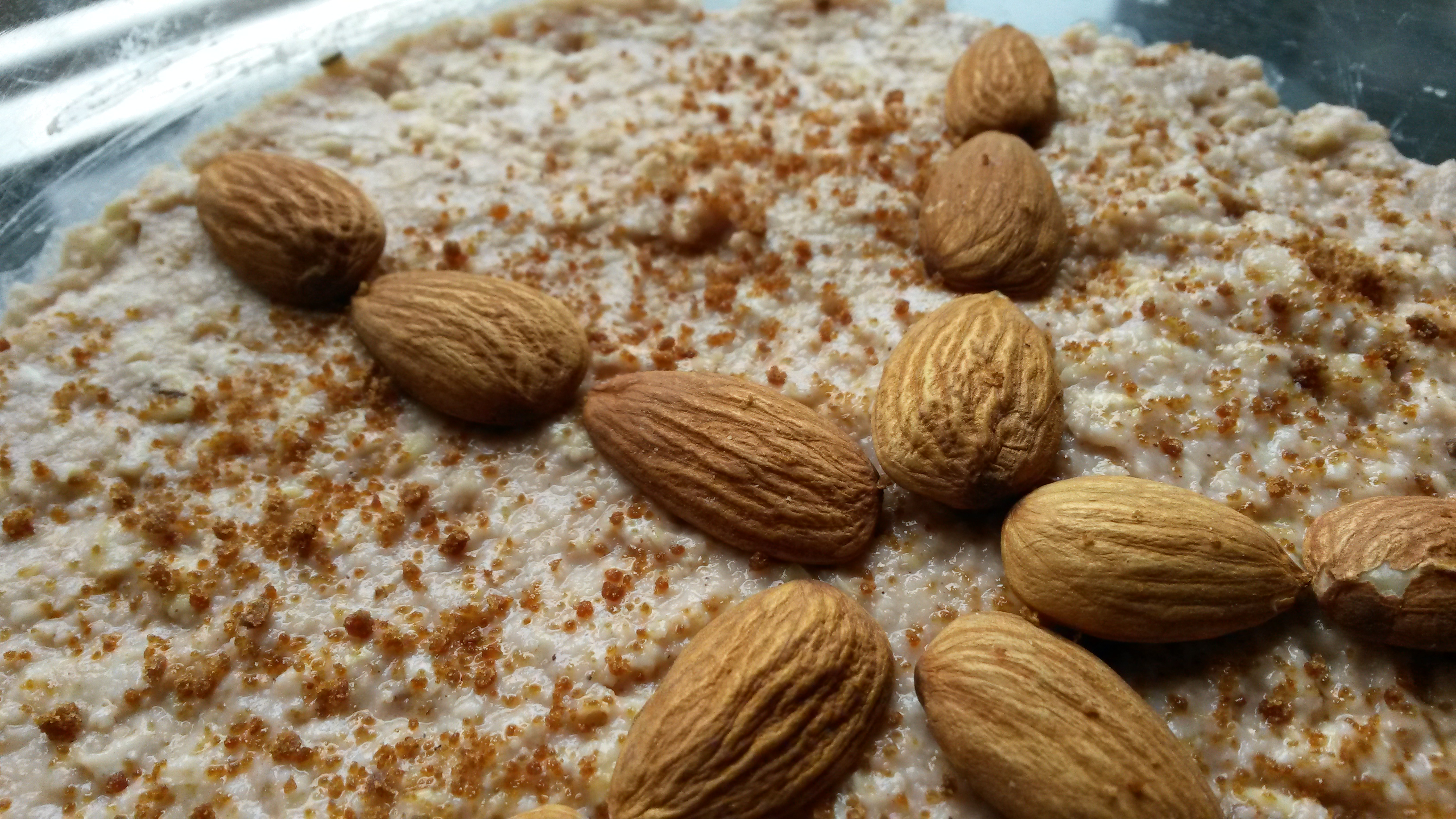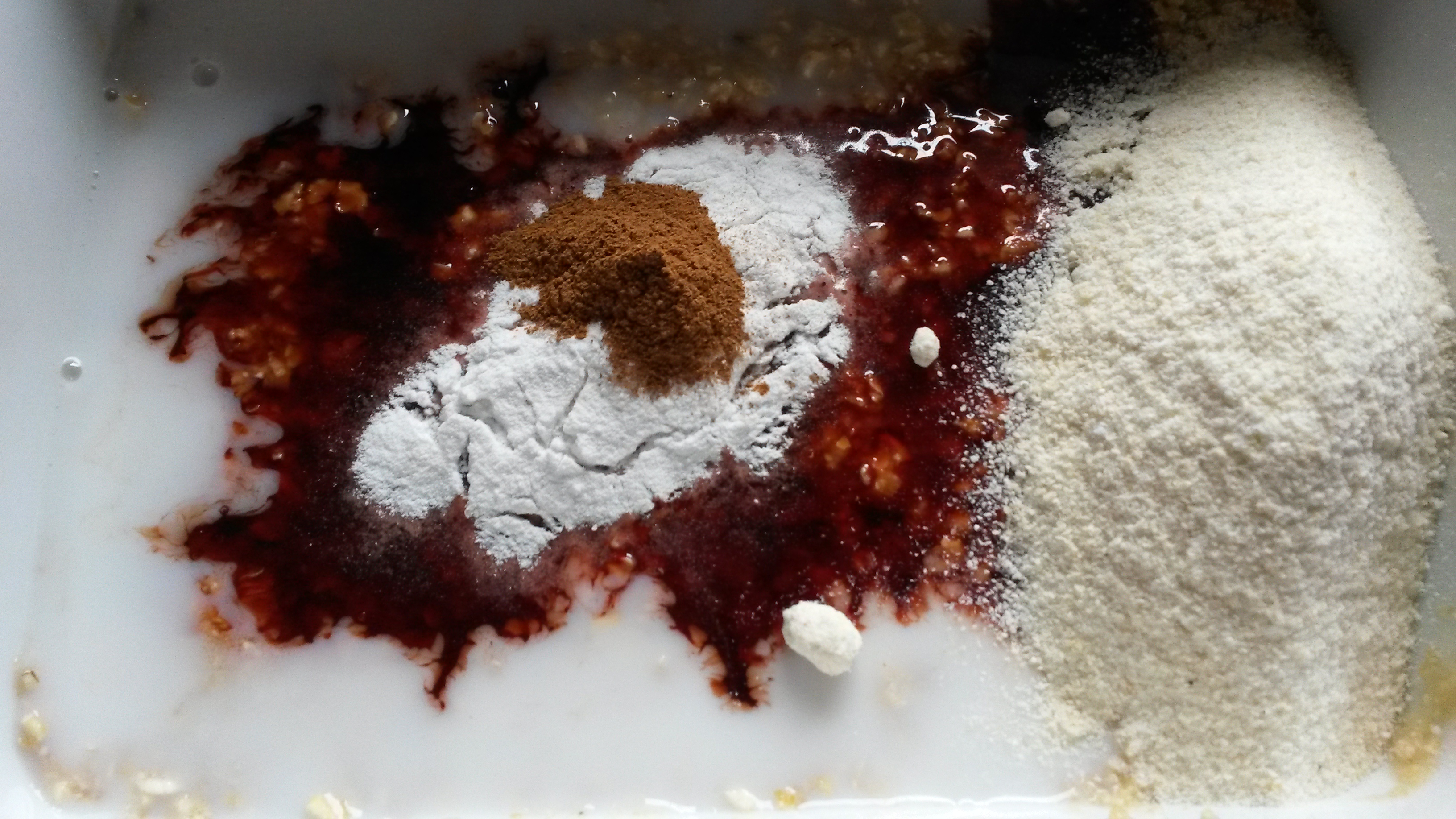 - Add the cinnamon, date syrup, baking powder, milk and xanthan gum to the soaked oats