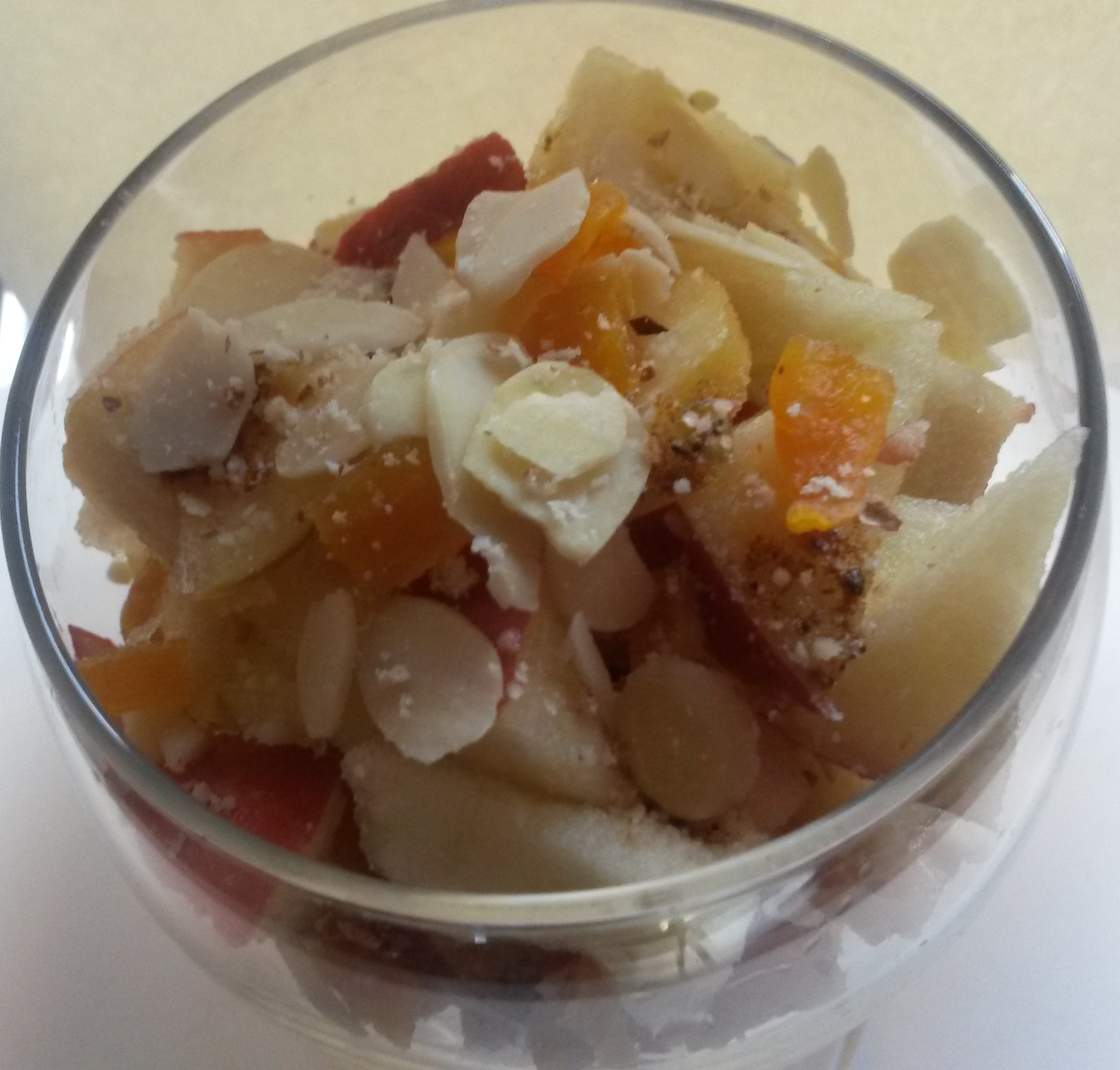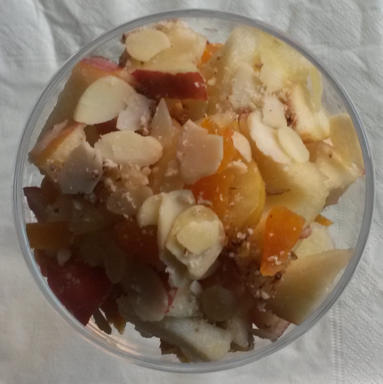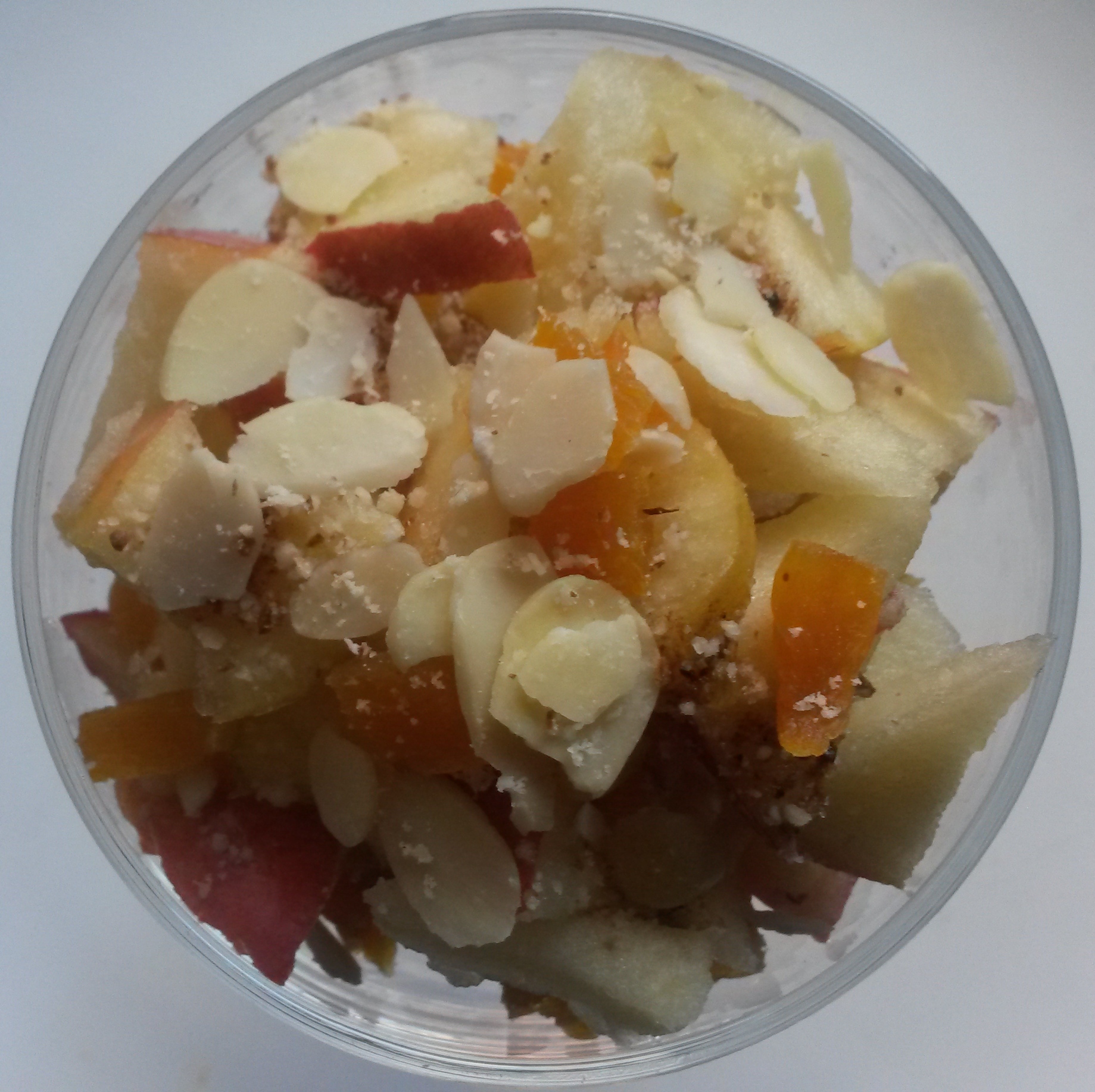 - Assemble! Put a layer of apple in a cup and dot with the spice mix. Add a layer of apricot followed by a layer of almond crumb. Repeat twice.