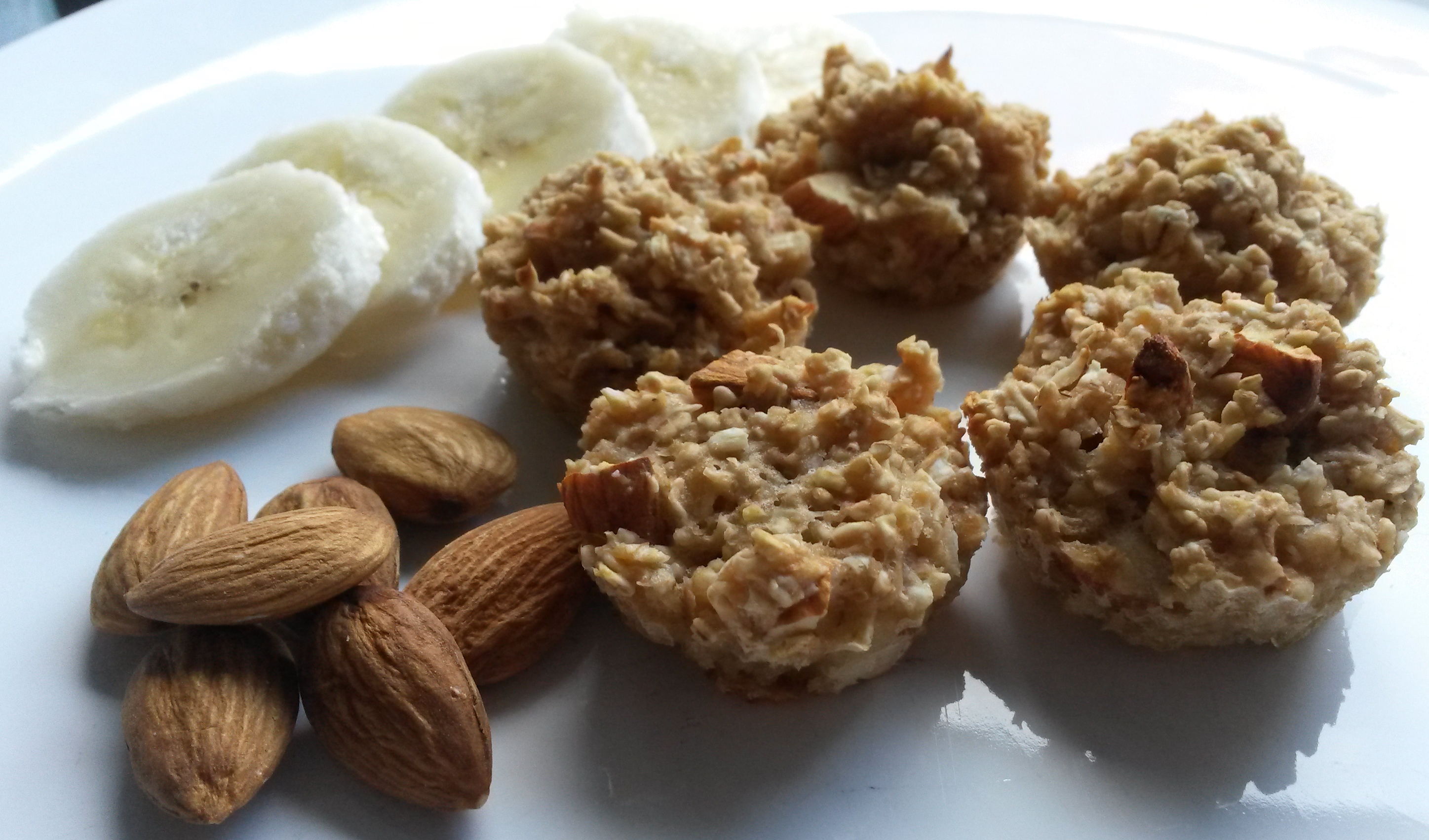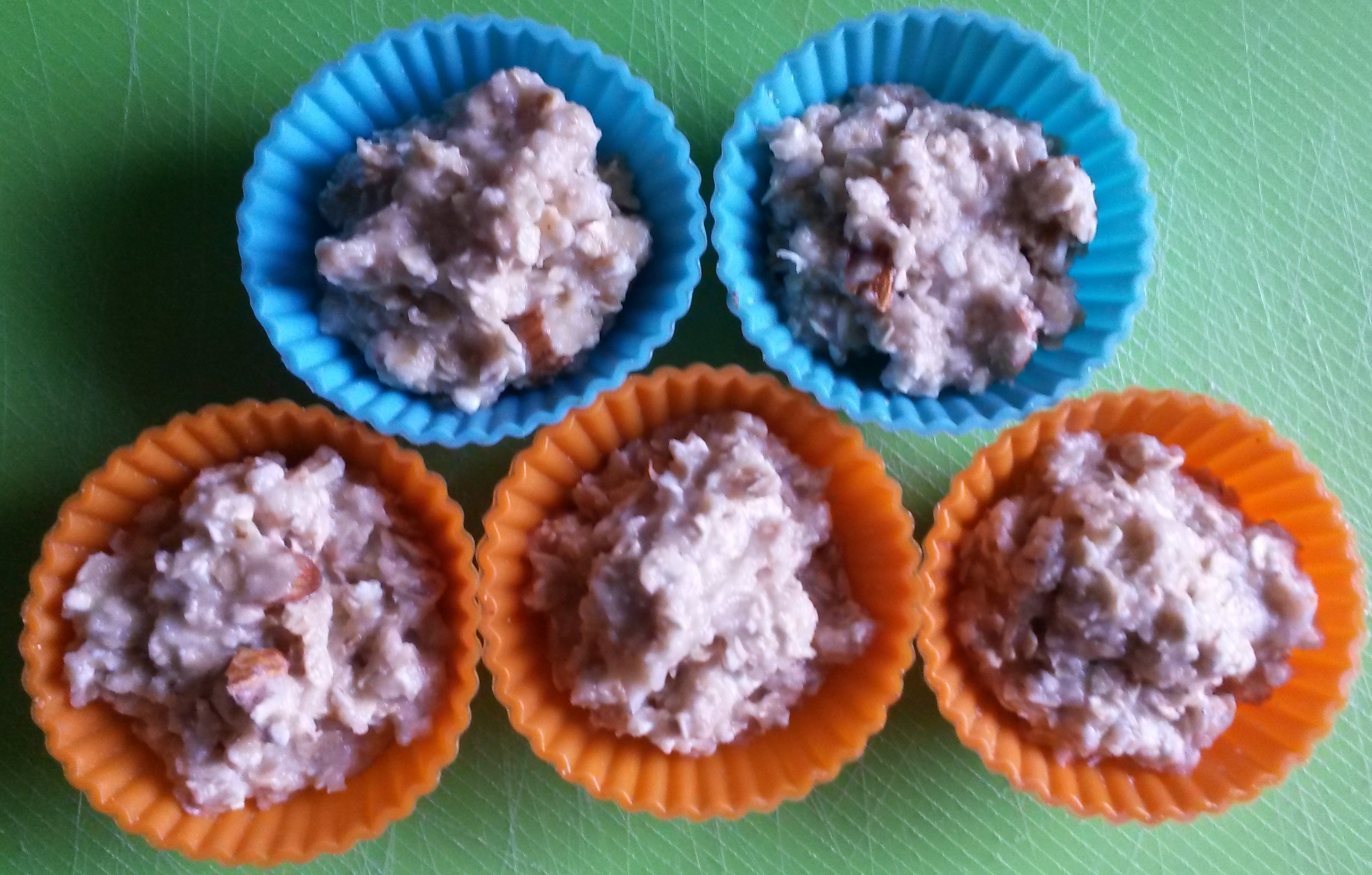 It’s another cold and frosty morning here in the UK so breakfast needed to be something hot and comforting! Although I do love a bowl of porridge with almond butter and sliced banana, today I wanted to try something different! I have seen several baked oatmeal recipes floating around and decided that (if I could avoid turning it into flapjack nom nom 🙂 ) I would give it a go. I baked this in silicon petit four cases so they are just the right size to pop in your mouth (if you’re anything like my husband) or for the daintier amongst us, to bite in half! This mixture made five which was just right for a filling protein punching breakfast! Have a look and see what you think?