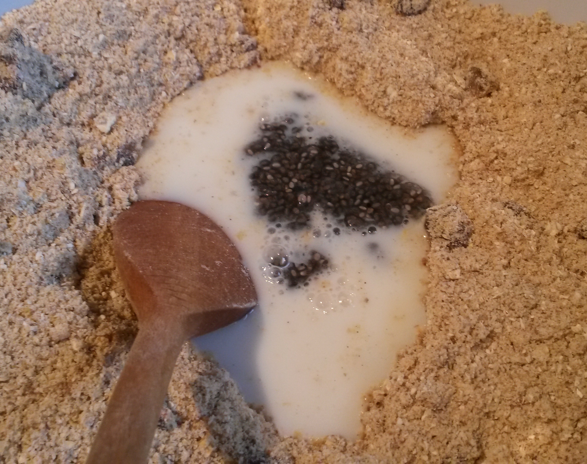 - Make a hole in the centre and pour in the milk and chia mixes.
