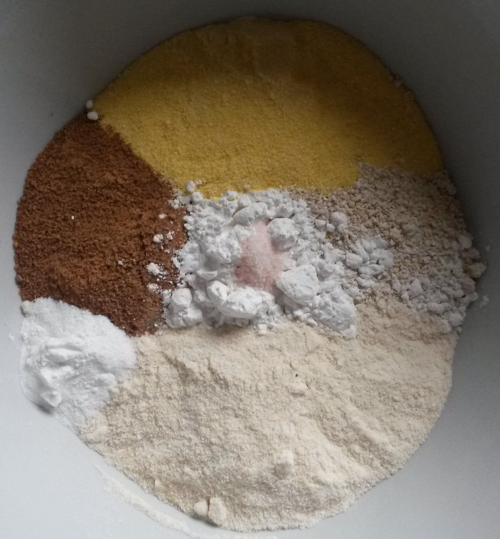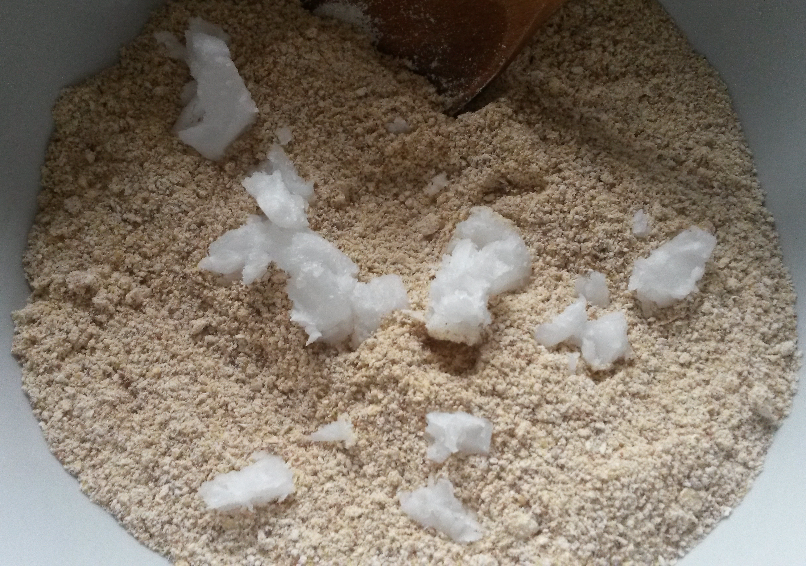 - Put the oats, sugar, flour, arrowroot, polenta, baking powder and salt in a large bowl, then mix.