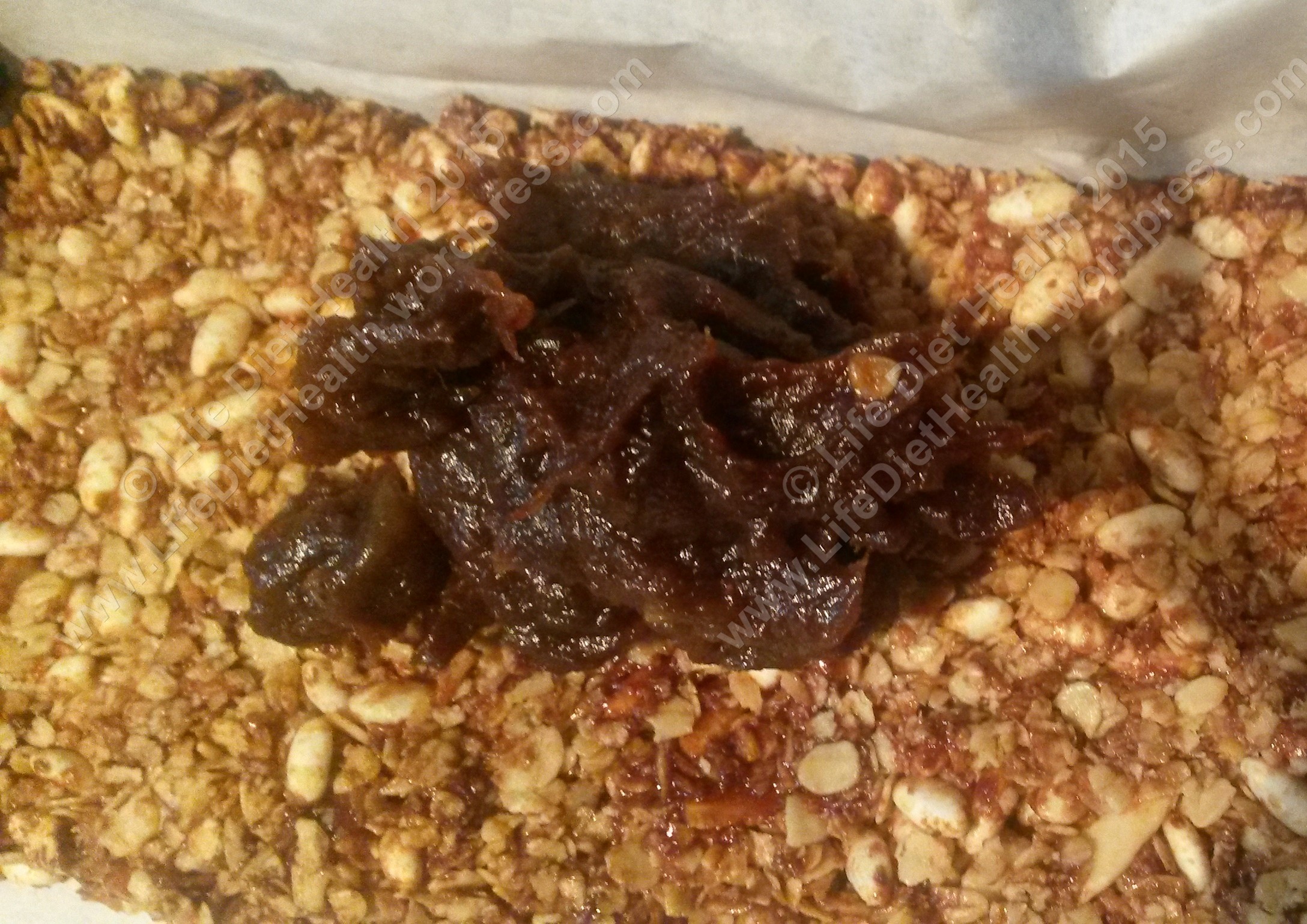 - Take the base out of the oven and carefully spread the date mixture thinly over the top.