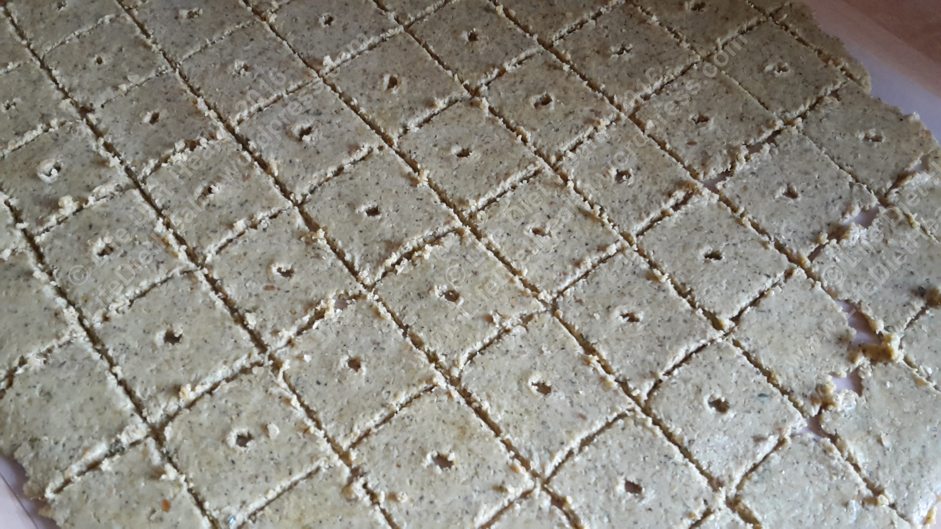 - Carefully transfer to a lined or greased baking sheet (you need two) leaving a small space between each cracker.