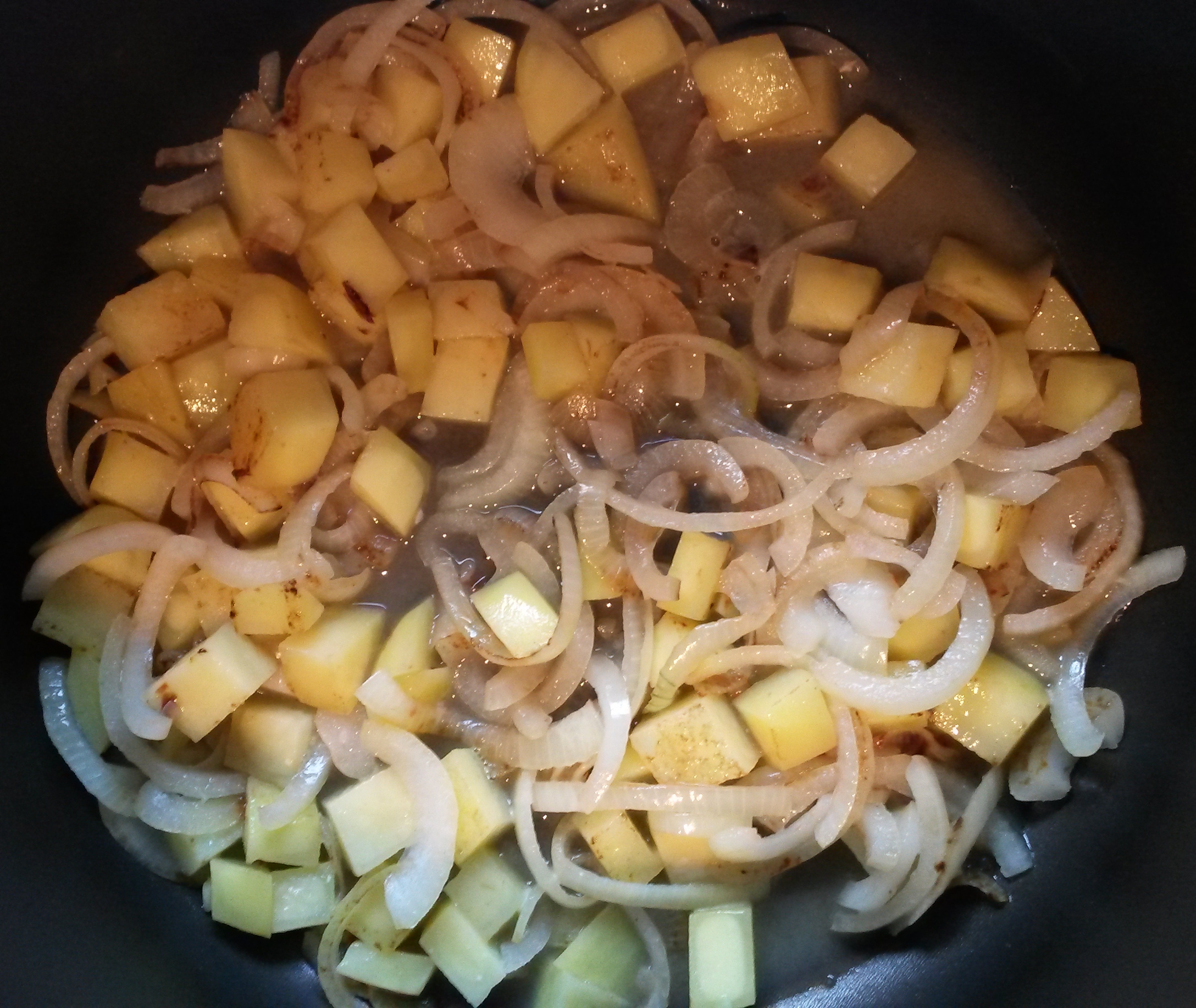 - Melt the coconut oil in a large saucepan and add the onion and potato