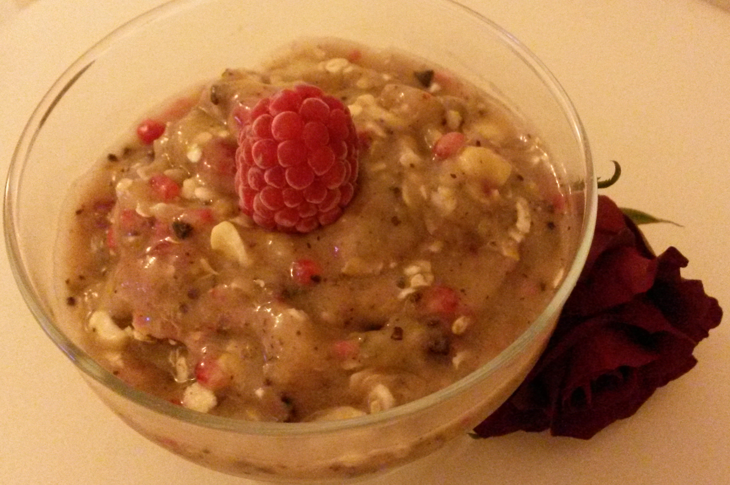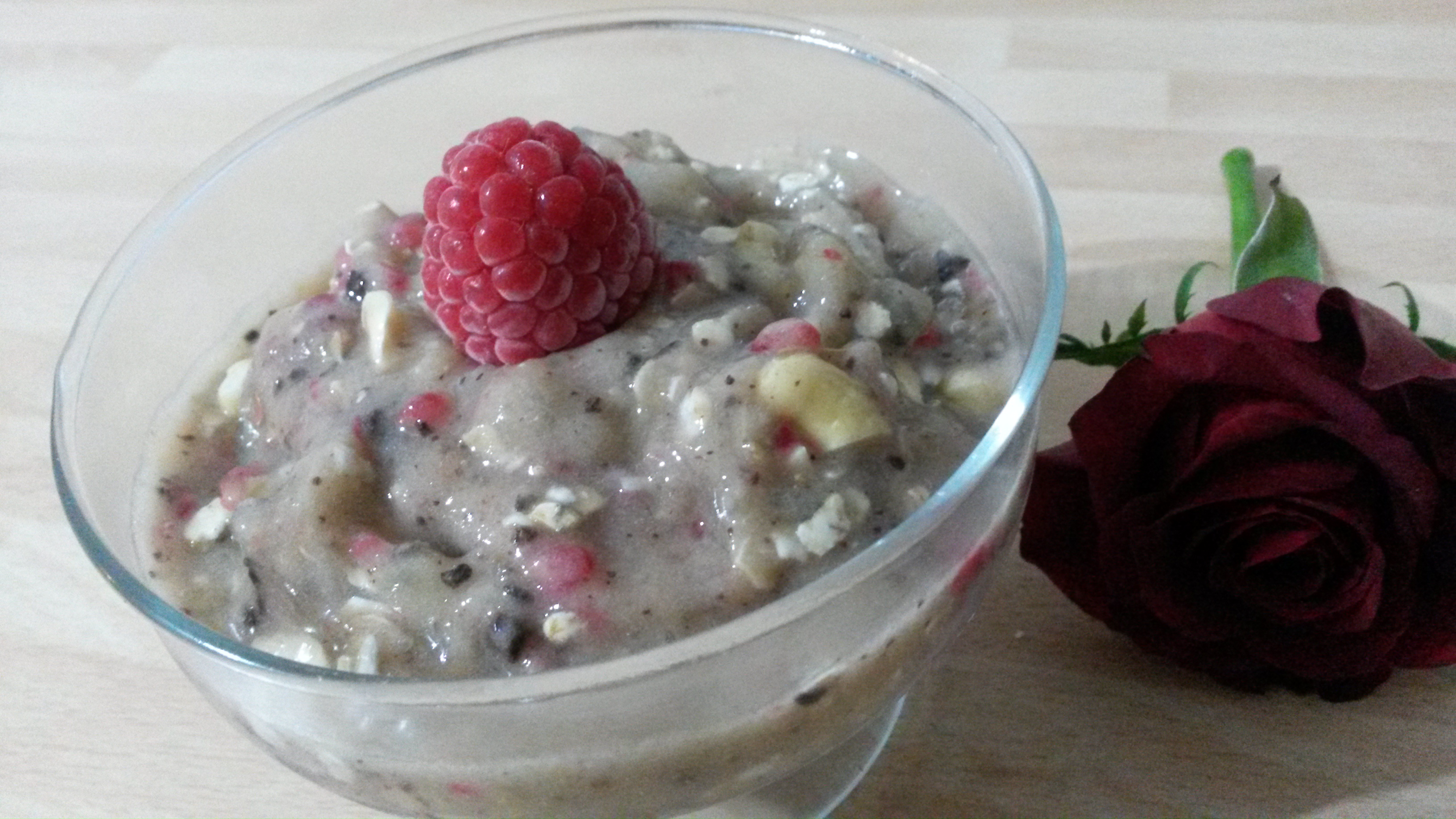 - Put the banana, raspberries and agave in a blender and blitz until almost smooth. Add the chocolate and pulse to mix in.