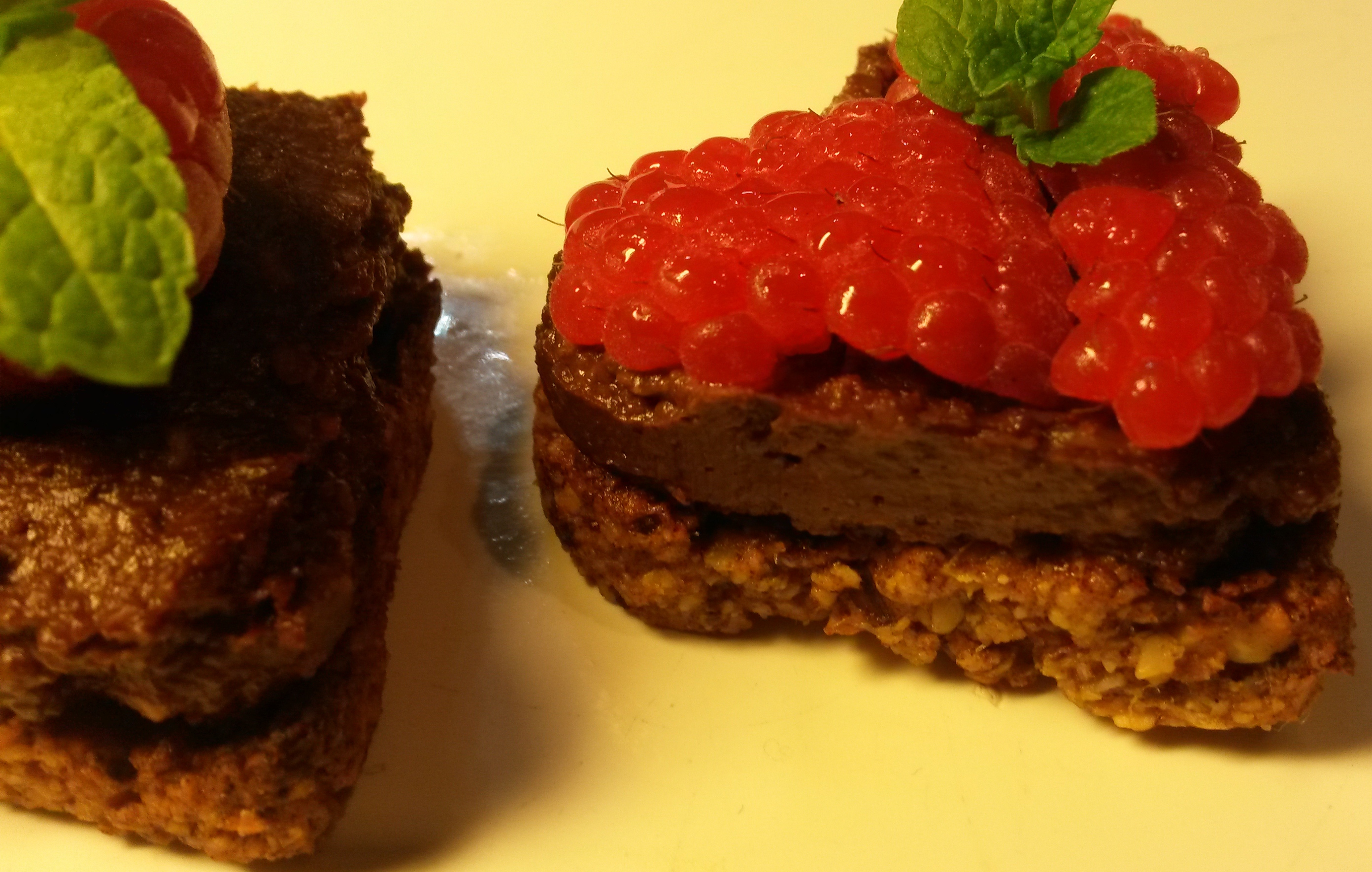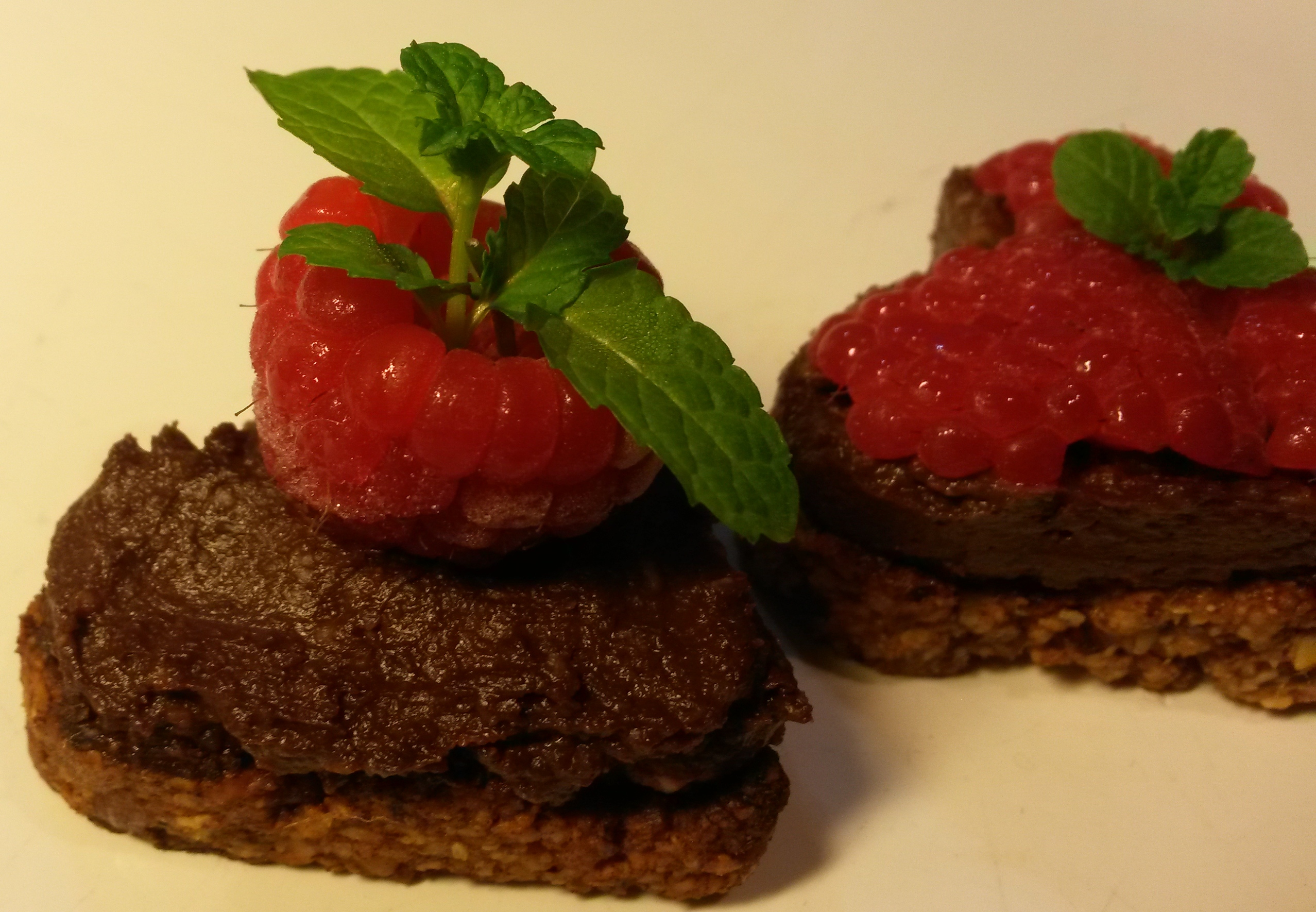 - I used frozen raspberries as they are much easier to manipulate and position when frozen! You can either use whole raspberries, or pull them apart carefully and position them to make a blanket covering on the chocolate topping. Decorate with fresh mint and place in the fridge until ready to serve.