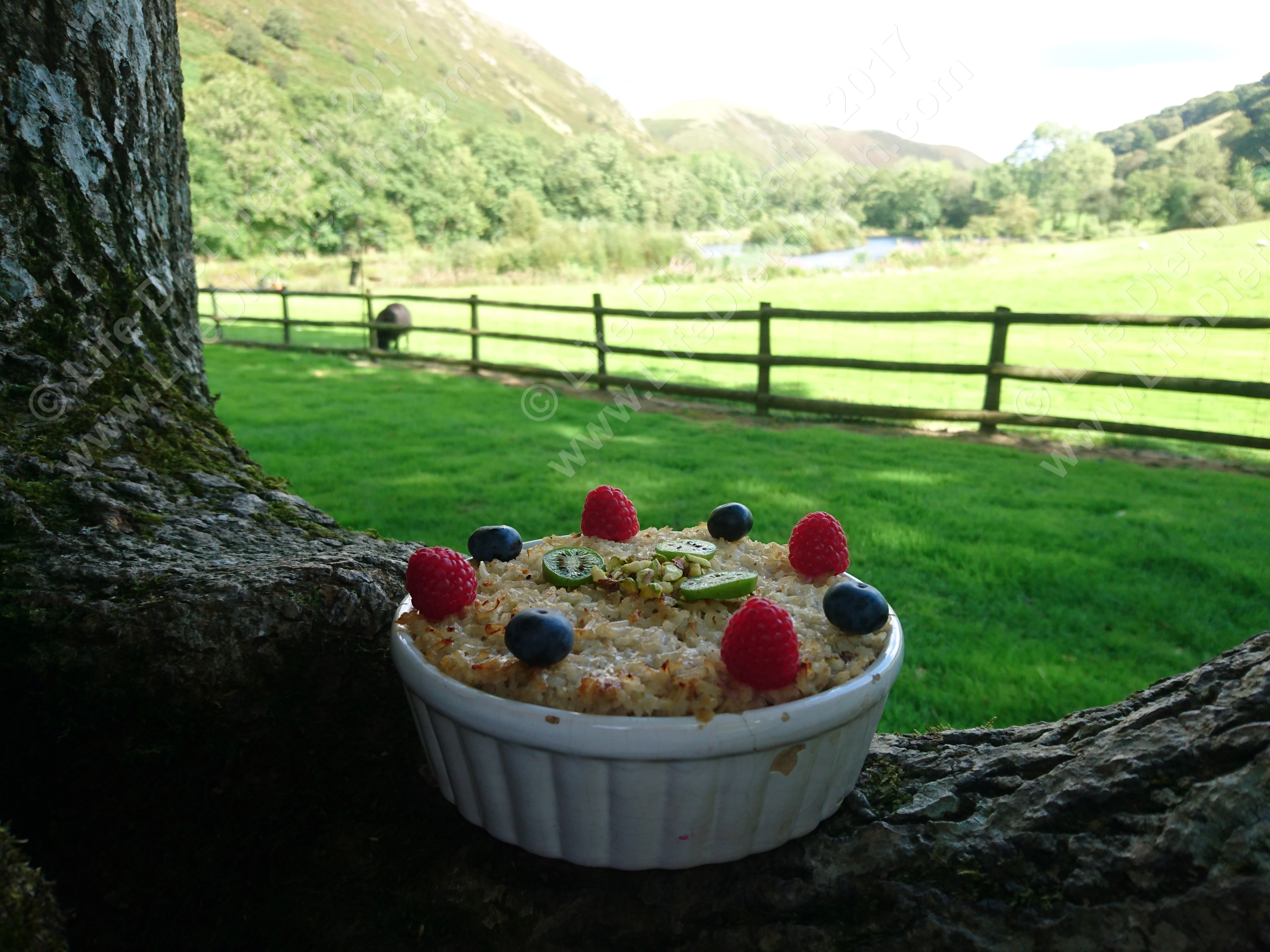 Of course there’s loads of other Autumn plants about, ooo, our apples are ready and we’ve been making delicious juice out of them for breakfast! 😀 Anyway, with the cooler weather it’s once again time for hot desserts! This is a very simple method to make a quick rice pudding which you can customise to your liking – try adding your favourite spice, add a few chunks of fresh apple, dried apricot or as I did (as I wasn’t in my own kitchen), add some nuts for flavour and add fresh fruits when serving.