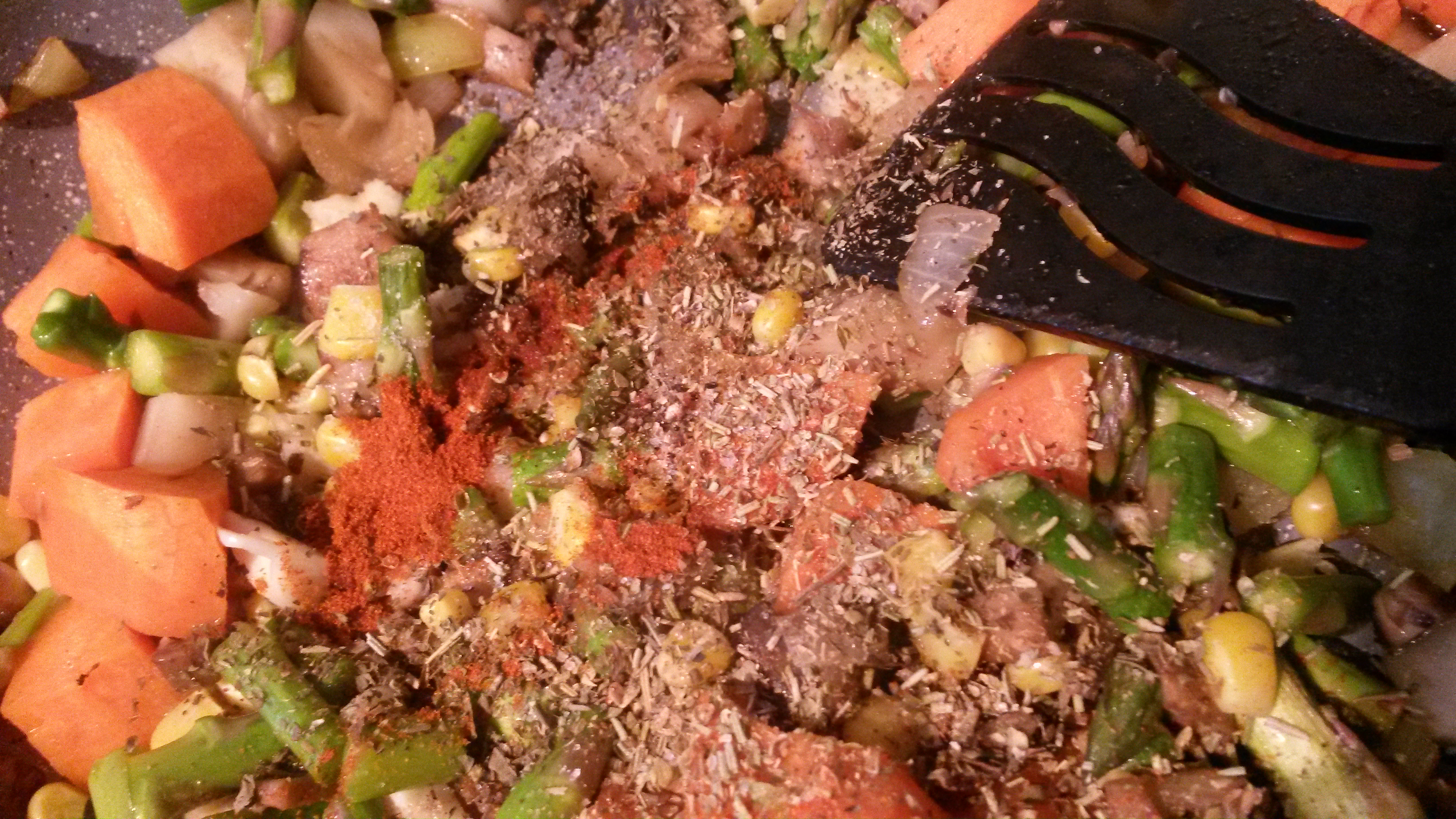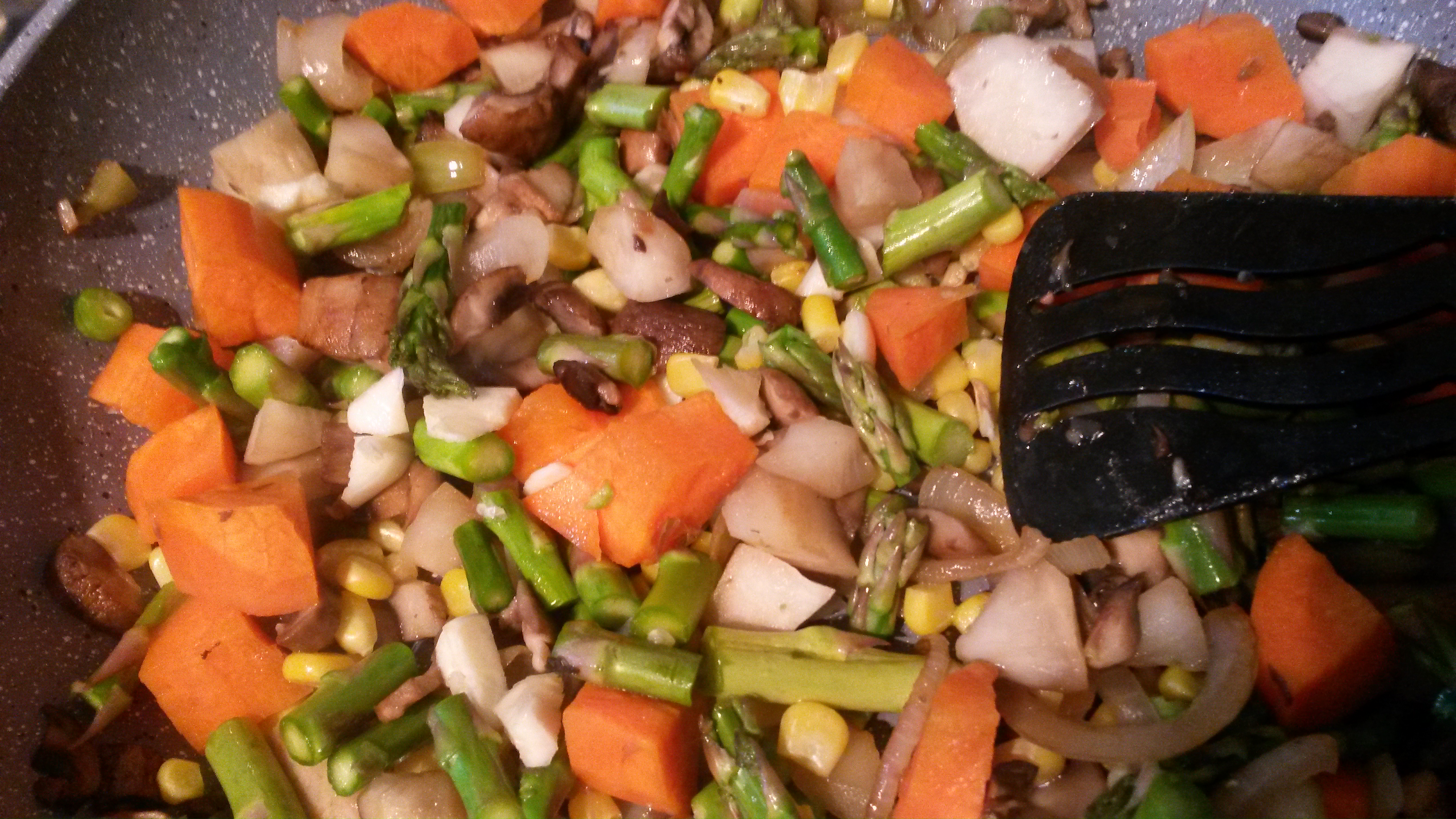 - Melt 10ml of coconut oil in a large pan and add the mushrooms and onion. Cook until changing colour then add the artichoke and carrot. Cook for five minutes before adding the asparagus and sweetcorn.