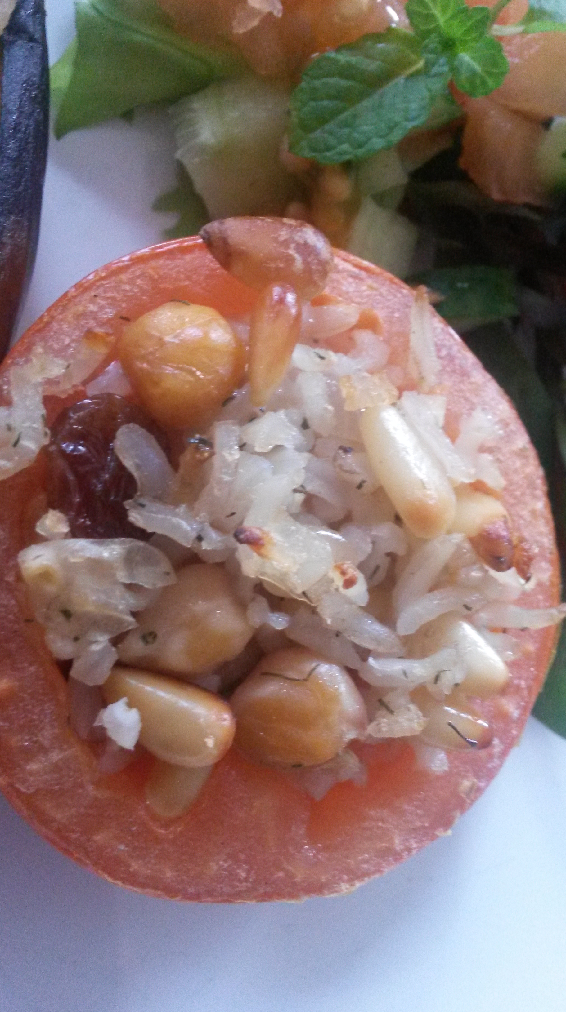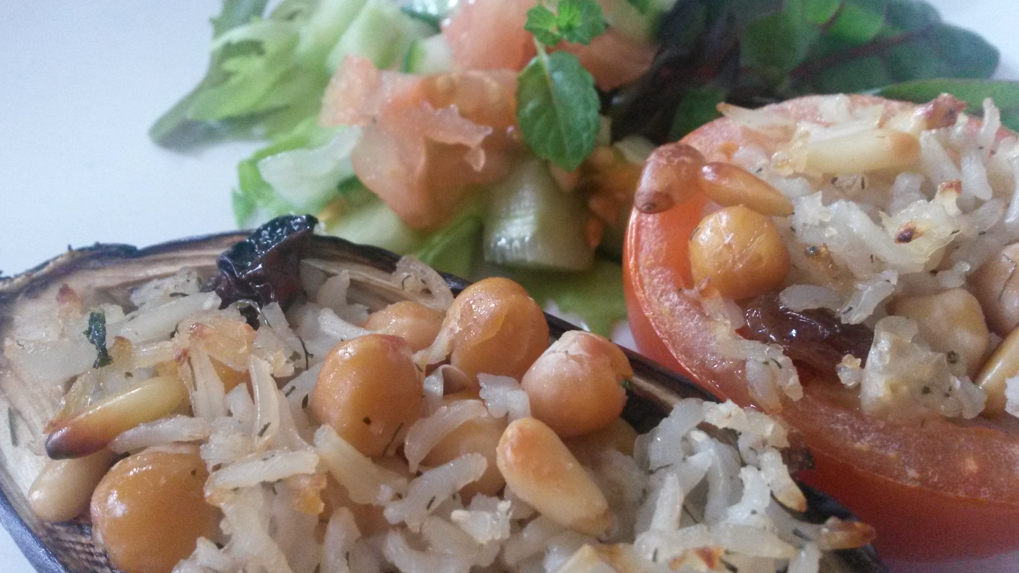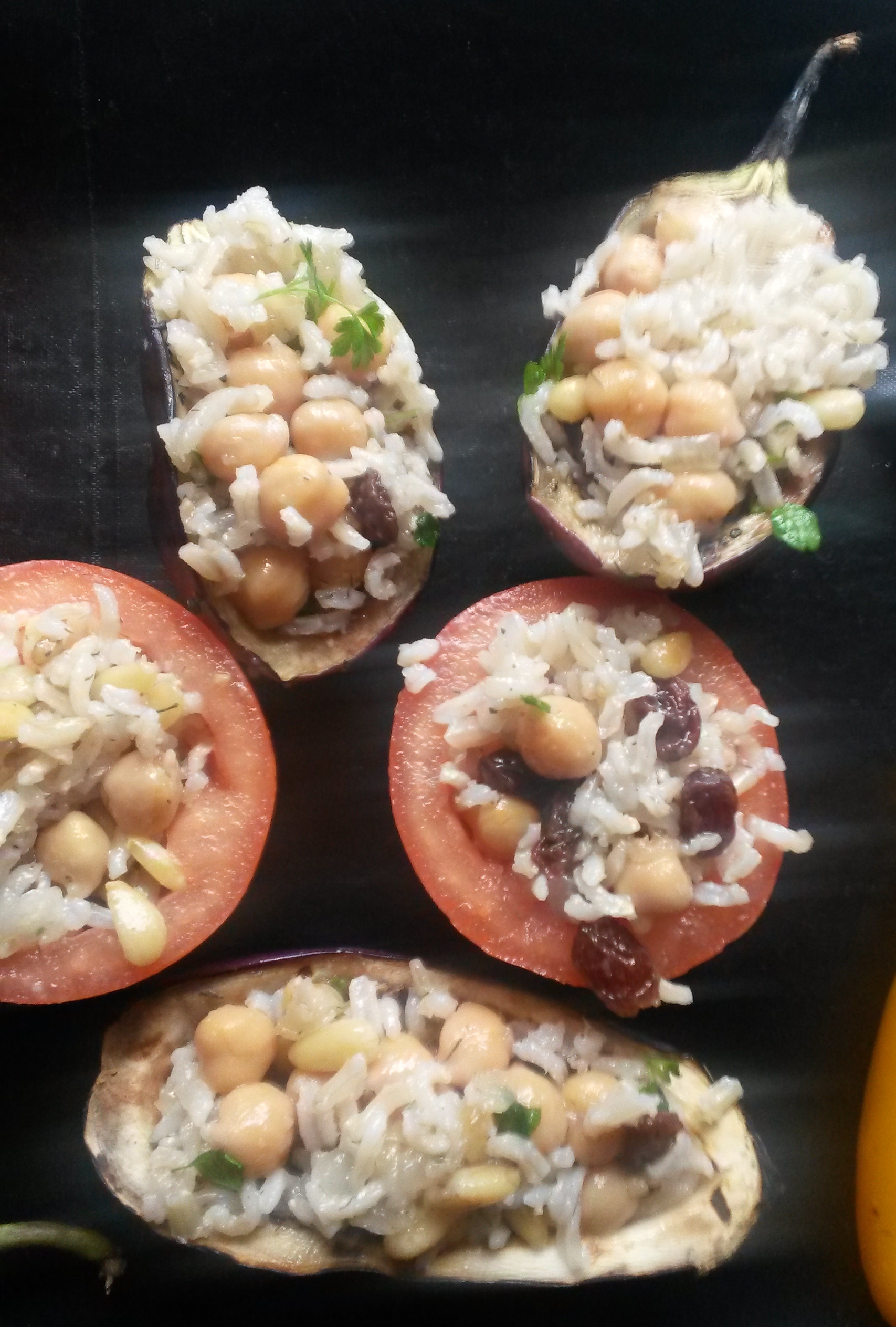 One of my favourite Middle Eastern foods has to be dolma. The word ‘dolma’ literally means ‘stuffed’ and although there are many many many different variations, the base of the recipe is always rice with spice, usually currants and often pine nuts (meat is also used but not here)! Traditionally especially in Turkish cooking, the word dolma actually relates to the stuffed vegetables, whereas the word ‘sarma’ is the type of dolma made from vine leaves all wrapped up into neat little parcels. The vegetables which are usually stuffed are aubergines, tomatoes, courgettes and peppers. Many traditional recipes bake the vegetables in water or stock which makes the vegetables very soft, but at least enables the rice to be cooked. As I would prefer my vegetables to remain bright and colourful, full of flavour and with a bit of bite, I have used an alternative method for cooking the dolma. This recipe won’t take hours and hours of your day 🙂 this was prepared as a quick meal when we had friends over for lunch.