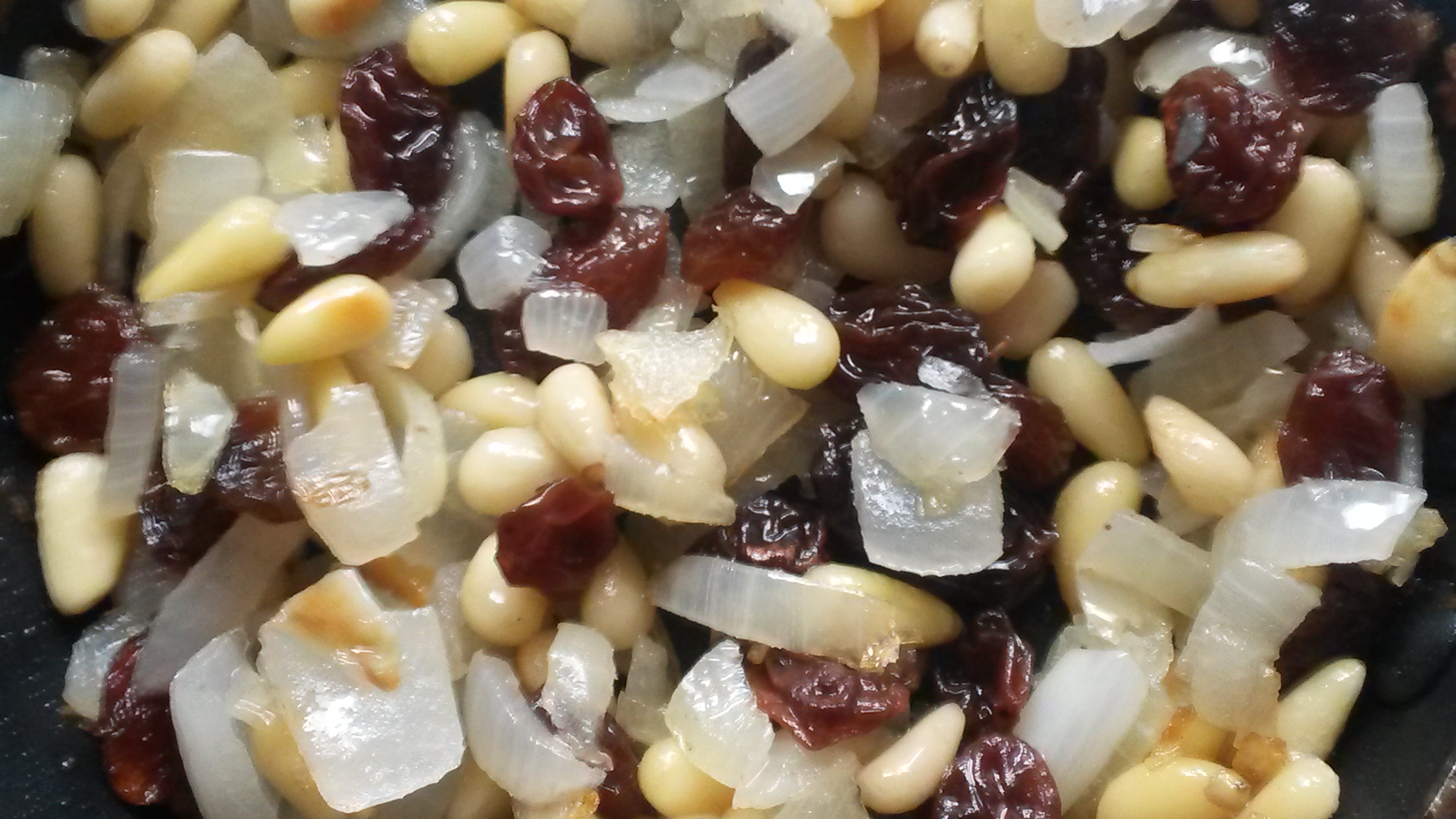 - Melt the coconut oil and cook the onion until changing colour. Add the pine nuts and raisins