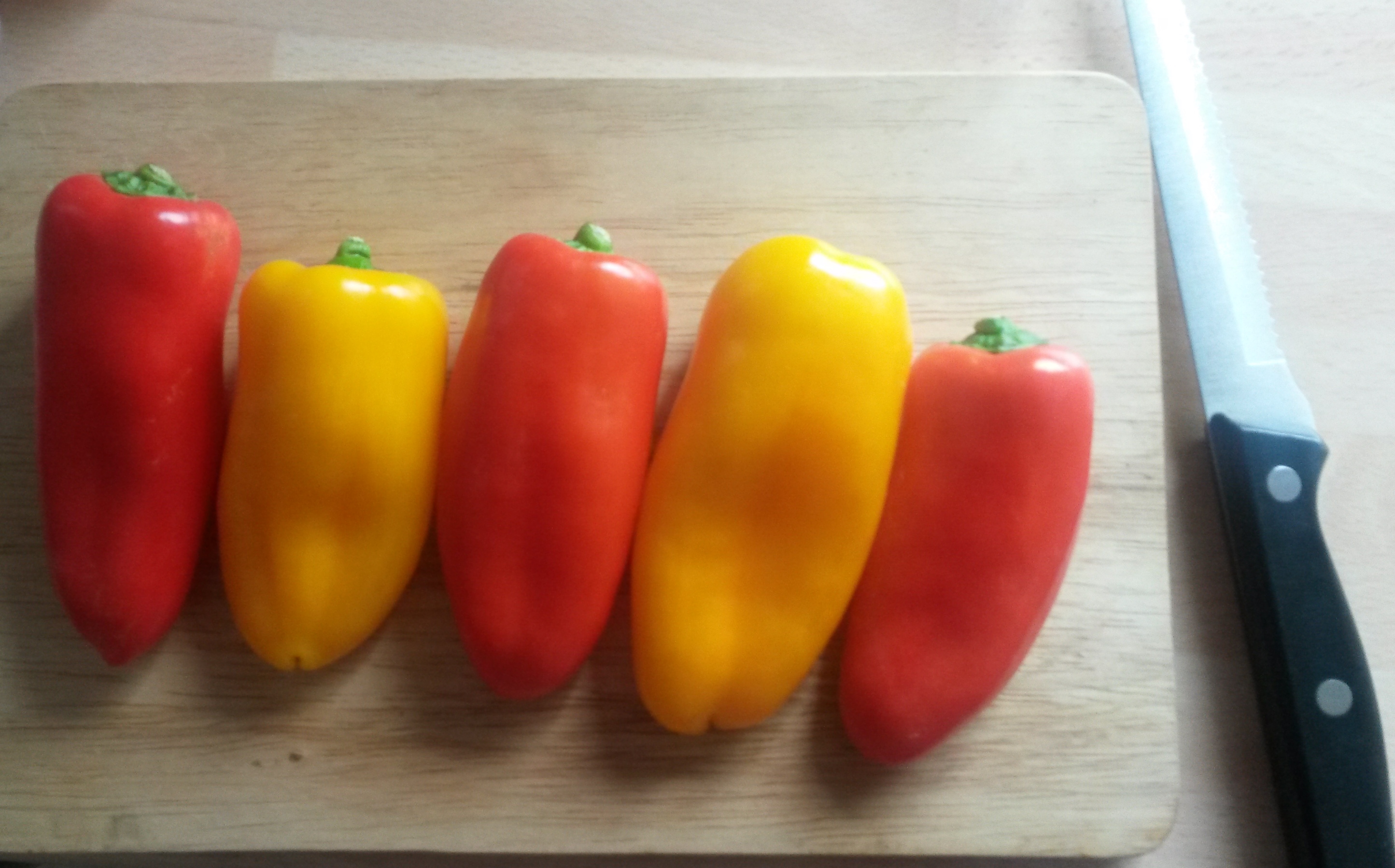 Carefully slice a lid in the top of the peppers and peel the seeds and membrane out. Larger vegetables (standard aubergines or courgettes) can be cut in half widthways and stood upright.