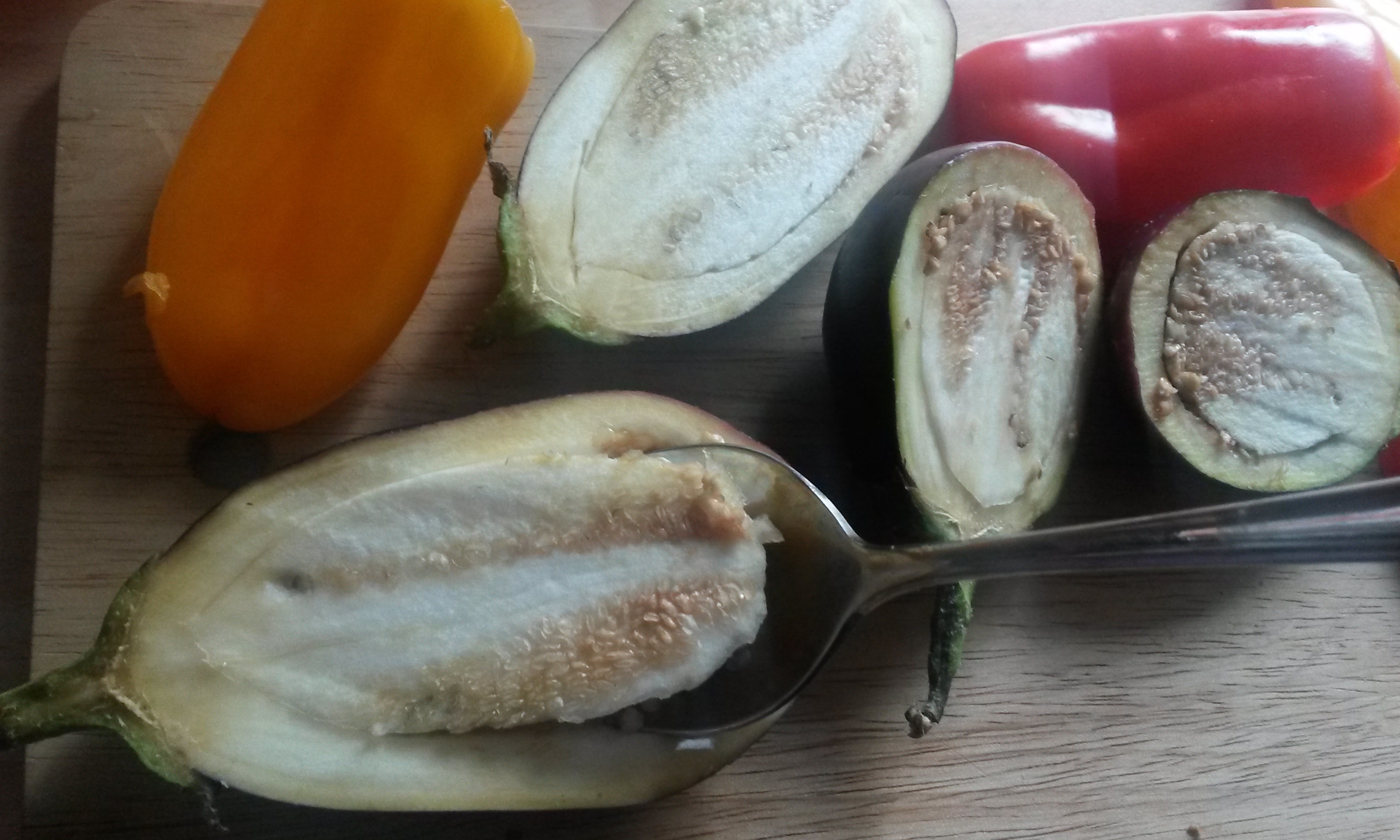 - Selection of ‘stuffable’ vegetables. We used mini aubergines (8), tomatoes (4) and small peppers (10)