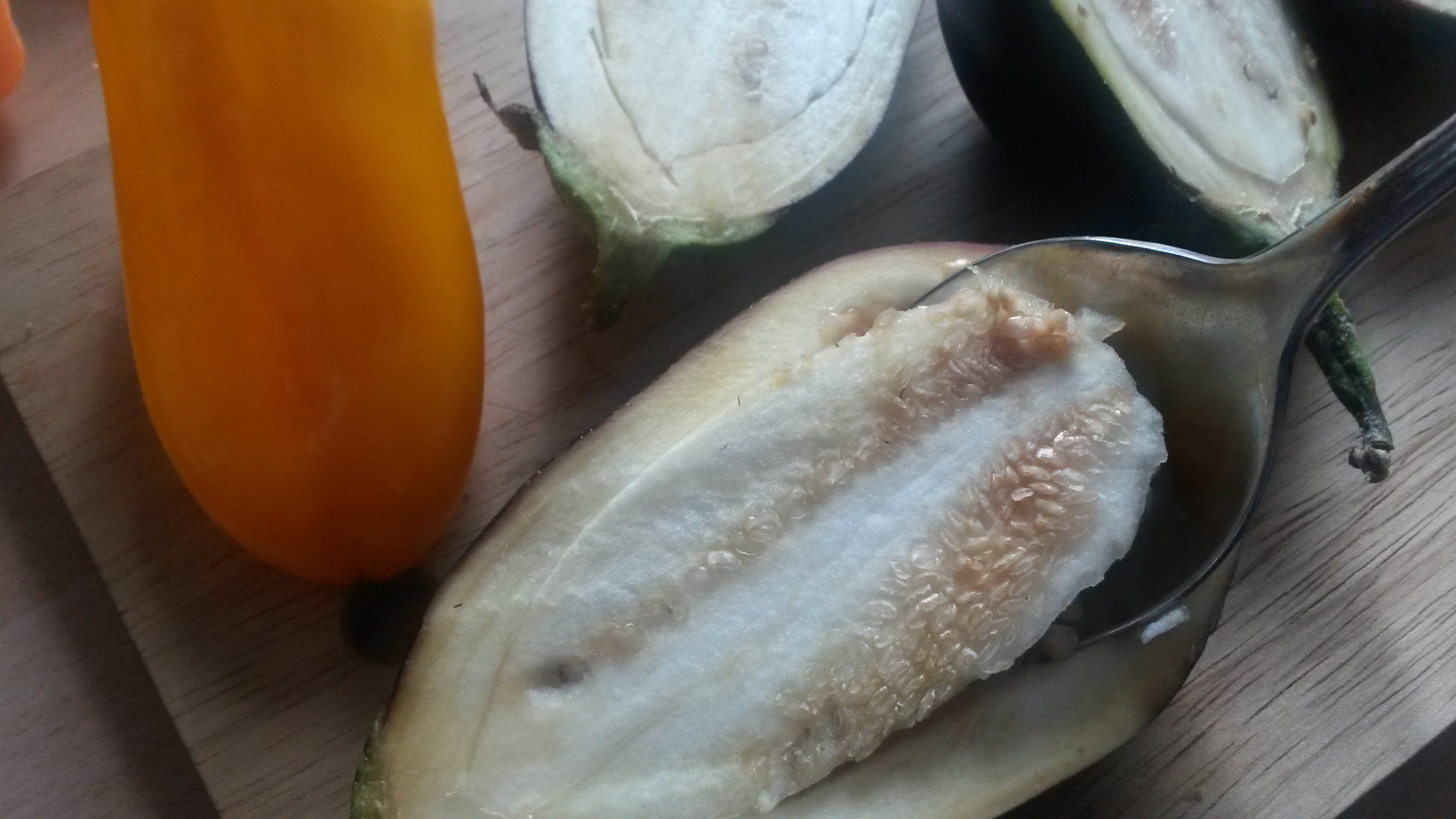 - While the onions are cooking, start preparing the vegetables. Cut tomatoes and aubergines in half and scoop out the insides.