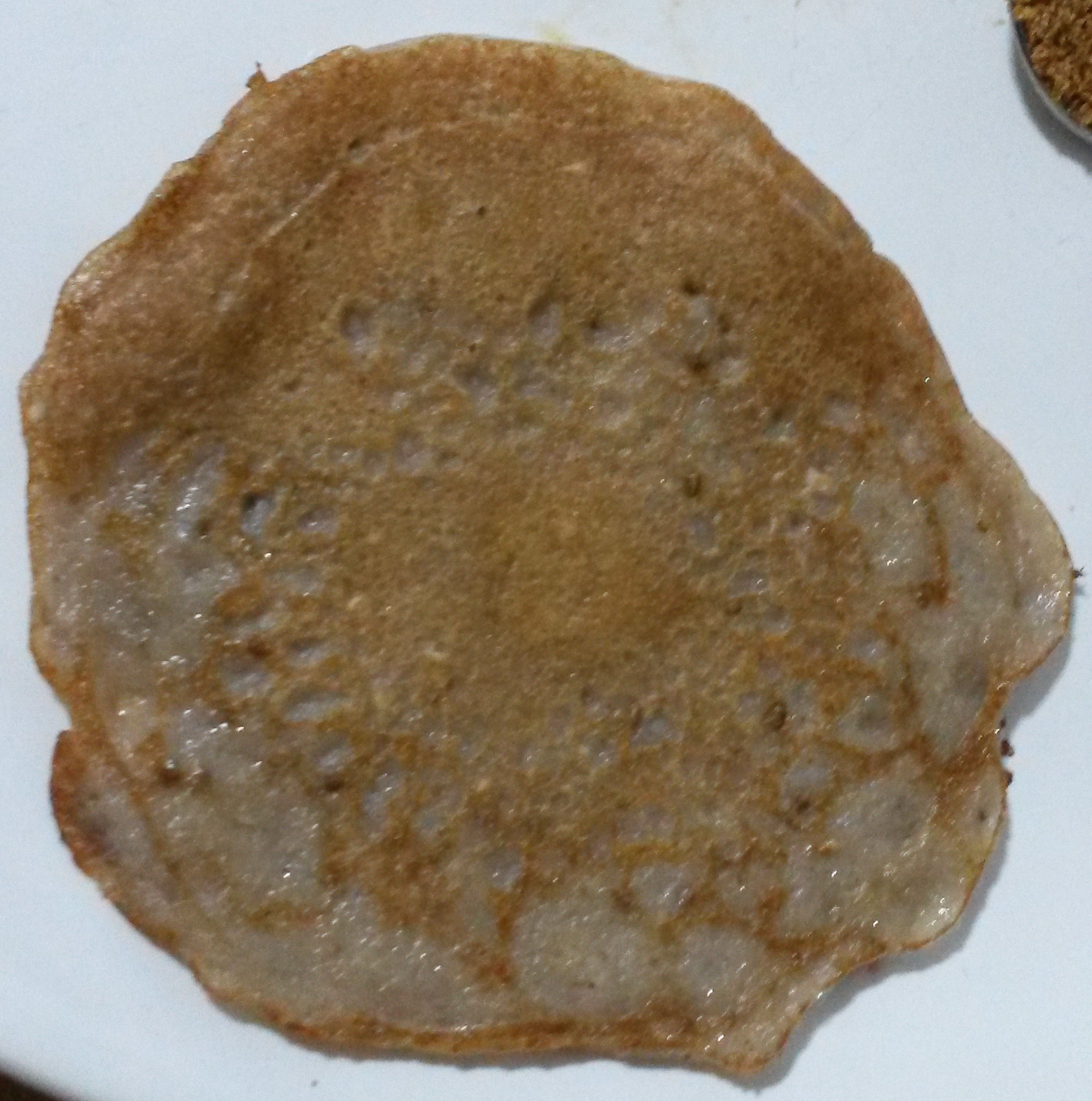 - Pour in a small amount of batter and immediately tilt the pan to get the required shape and an even thickness. Allow to cook until the edges start going crispy. Turn over with a spatula and lightly press down on the pancake. Cook until the underside is cooked.