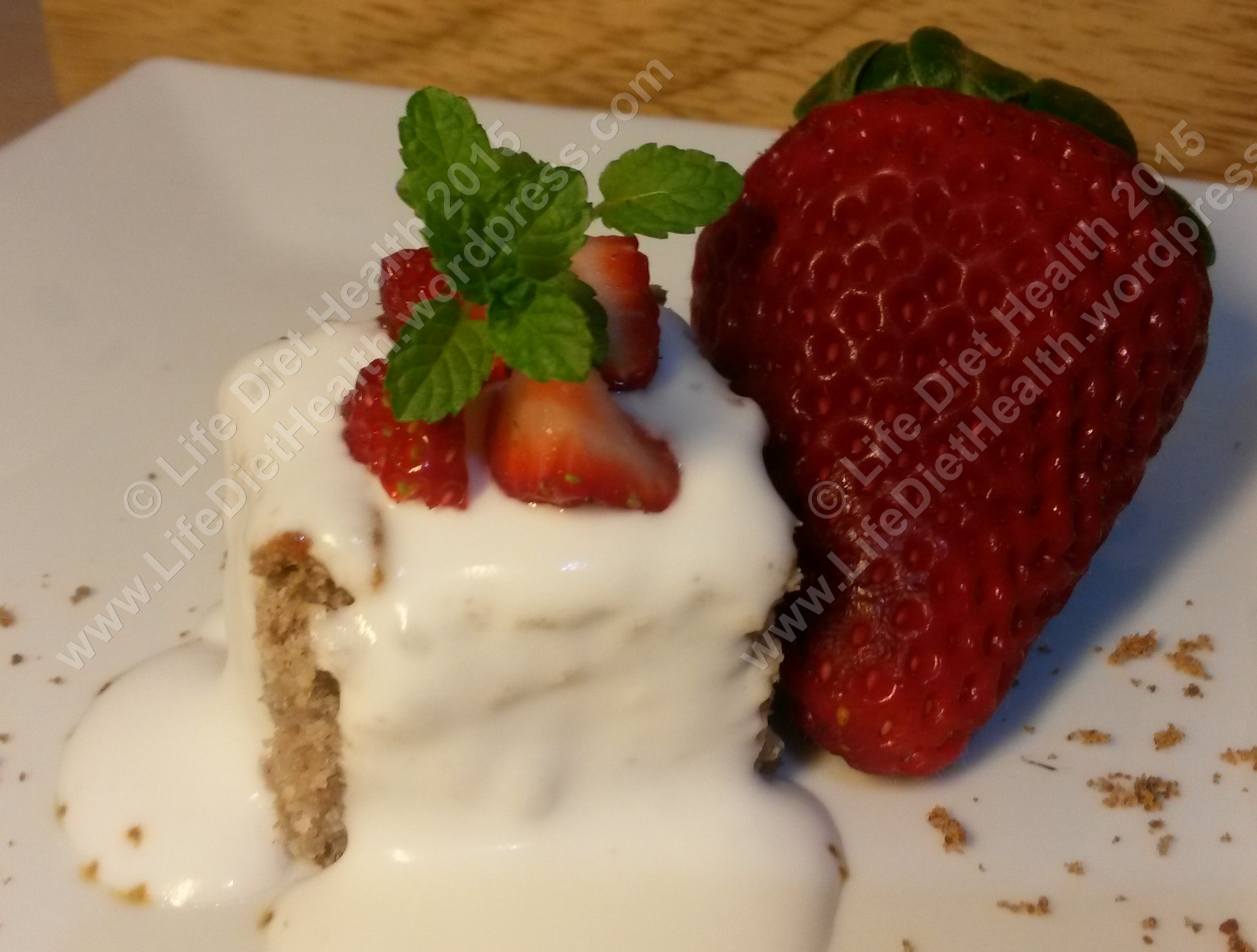 - Slice into squares for a whole dessert or into rectangles if you are layering – each rectangle should layer into three pieces. Cool before assembling. Thin the coconut cream if necessary with your preferred milk, pour over the dessert and decorate with strawberries. Use a slightly thicker cream if you are layering the dessert.