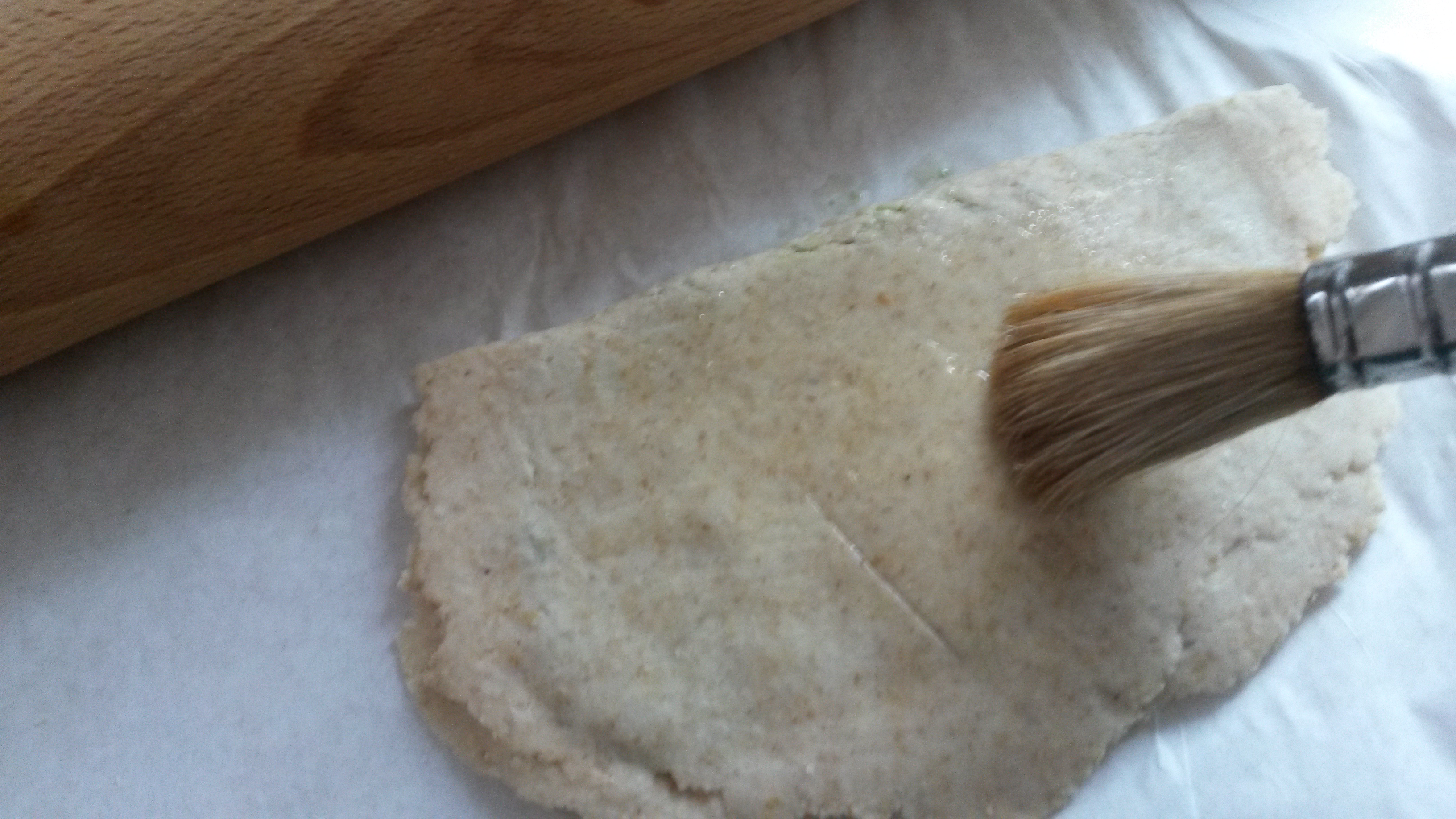 leaving a gap around the edge. Fold the other half of the dough over to enclose the filling and gently press the edges to seal. Lightly press with your rolling pin.