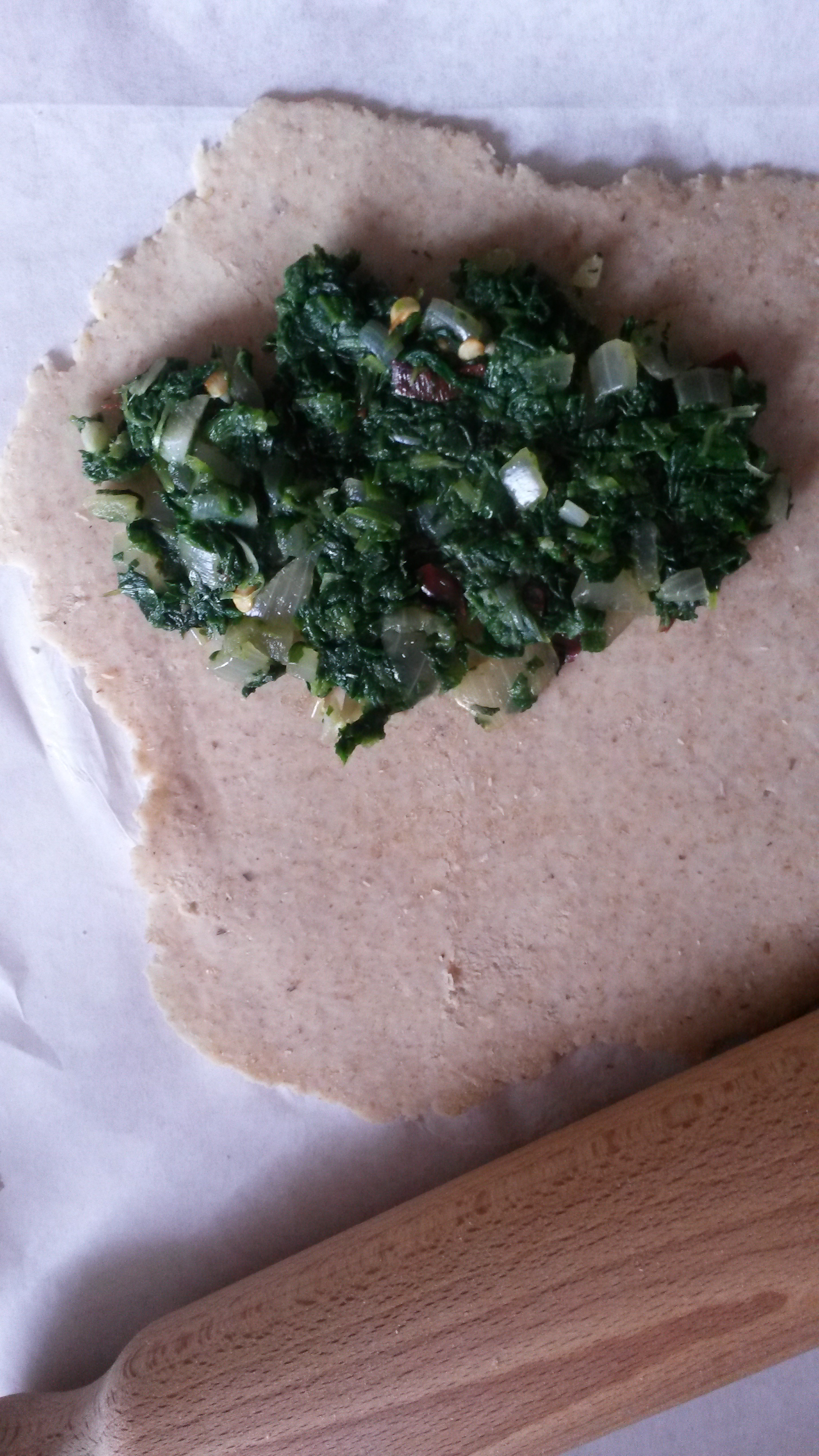 - Back to the dough! Divide the dough into six pieces. Roll a piece out until it is as thin as possible and put a spoonful of spinach filling on half of the dough
