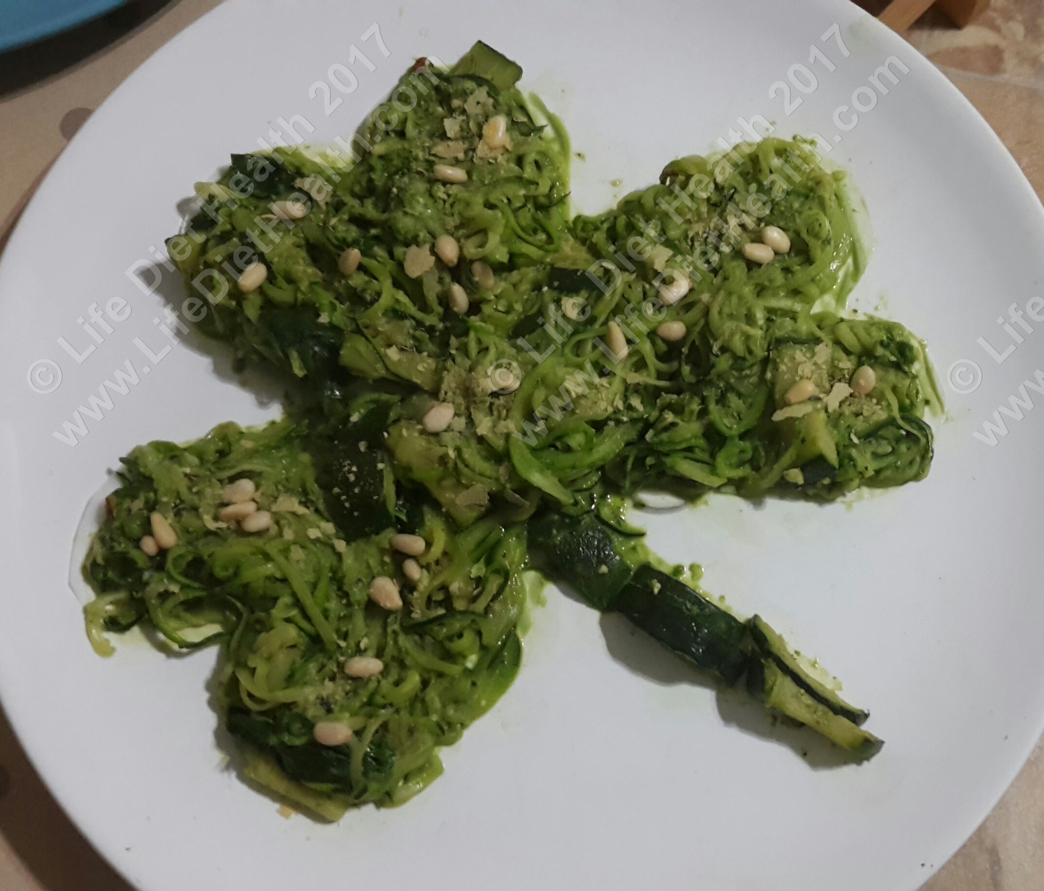 - Cooked version: Heat a sliver of oil in a non stick pan and add the courgette noodles – stir fry for one minute then add the spinach. When the spinach has wilted, add the pesto and heat through. Serve with toasted pine nuts for extra crunch.