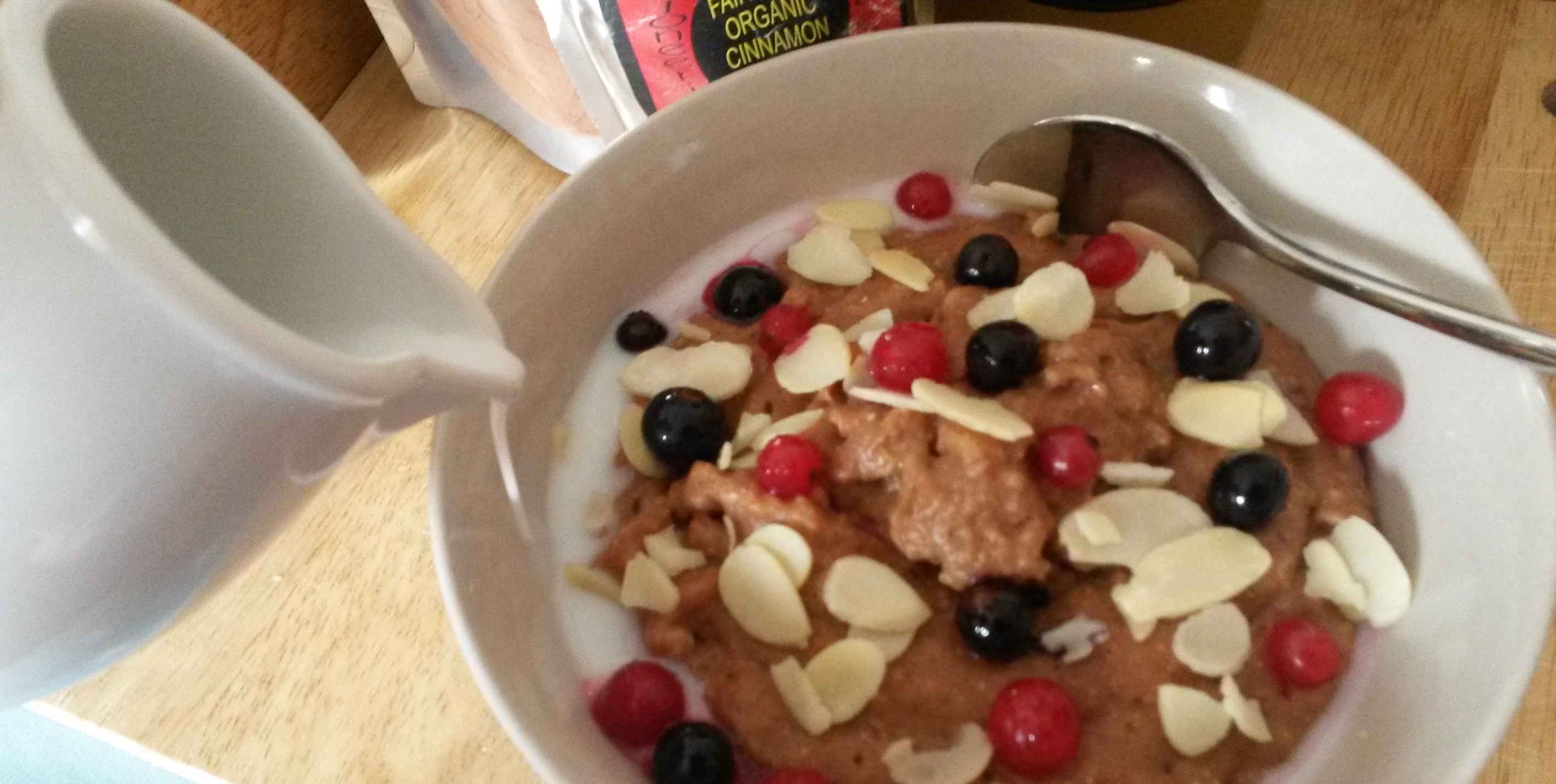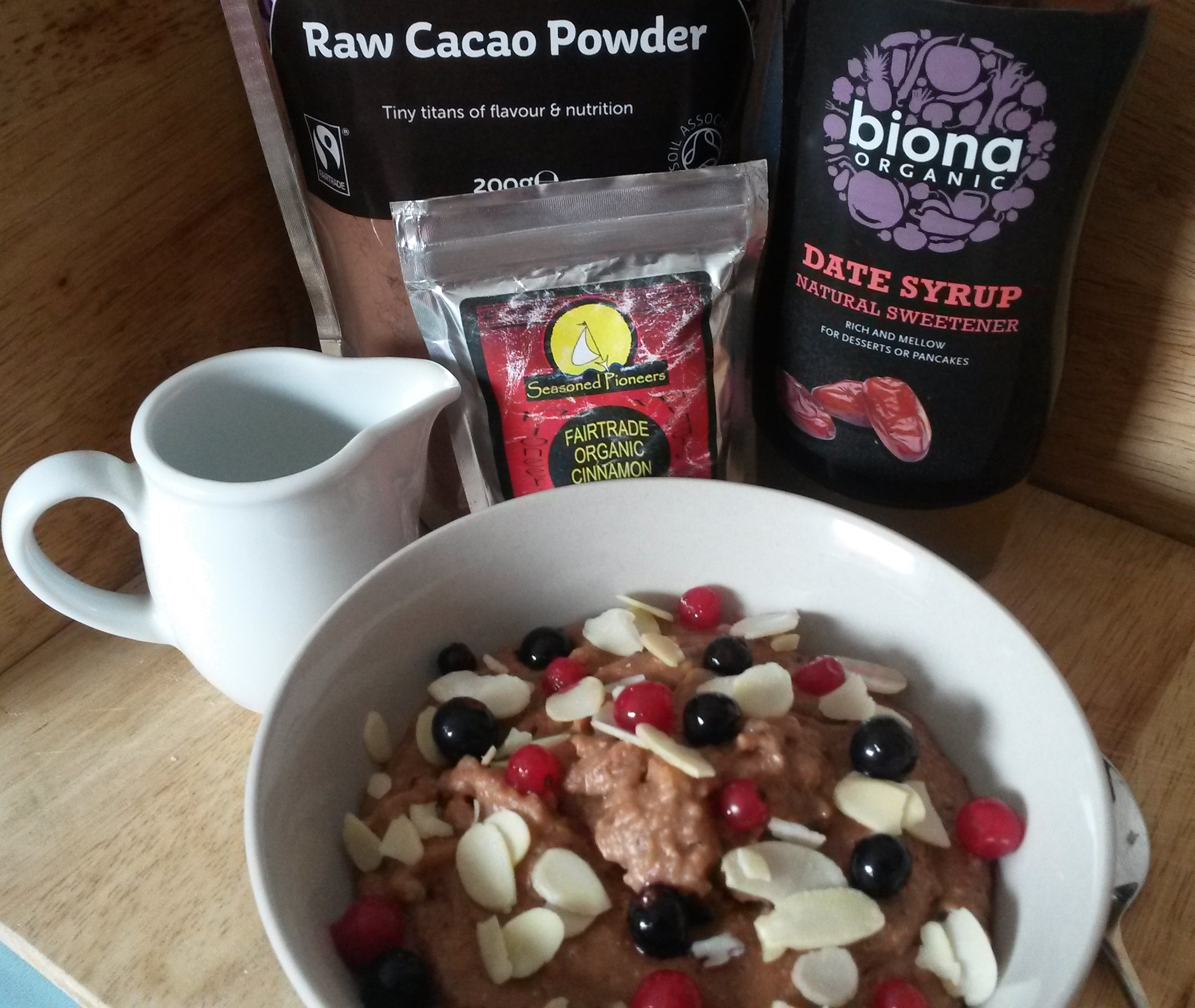 What happened to Spring? The weather has turned cold again 🙁 so I needed something warm and yummy for breakfast! Porridge sprung to mind but I wanted something more exciting 🙂 then I remembered that when we were younger we used to have ‘ready brek’. I’ve no idea how they get the fine floaty flakes that go in that box but I decided that if I made oat flour that would do! A few lot of tweaks later, the healthy chocolate breakfast bowl was born! 🙂 It doesn’t take much longer than making regular porridge but instead you get a smooth, creamy, nutritious, warming bowl of deliciousness! Yes!!! 😛 Chocolate for breakfast and it ‘is’ healthy!!! 🙂 🙂 🙂 This chocolate bowl is full of protein, iron, magnesium, calcium, riboflavin, vitamin E and a load of antioxidants 🙂 Yumyum!