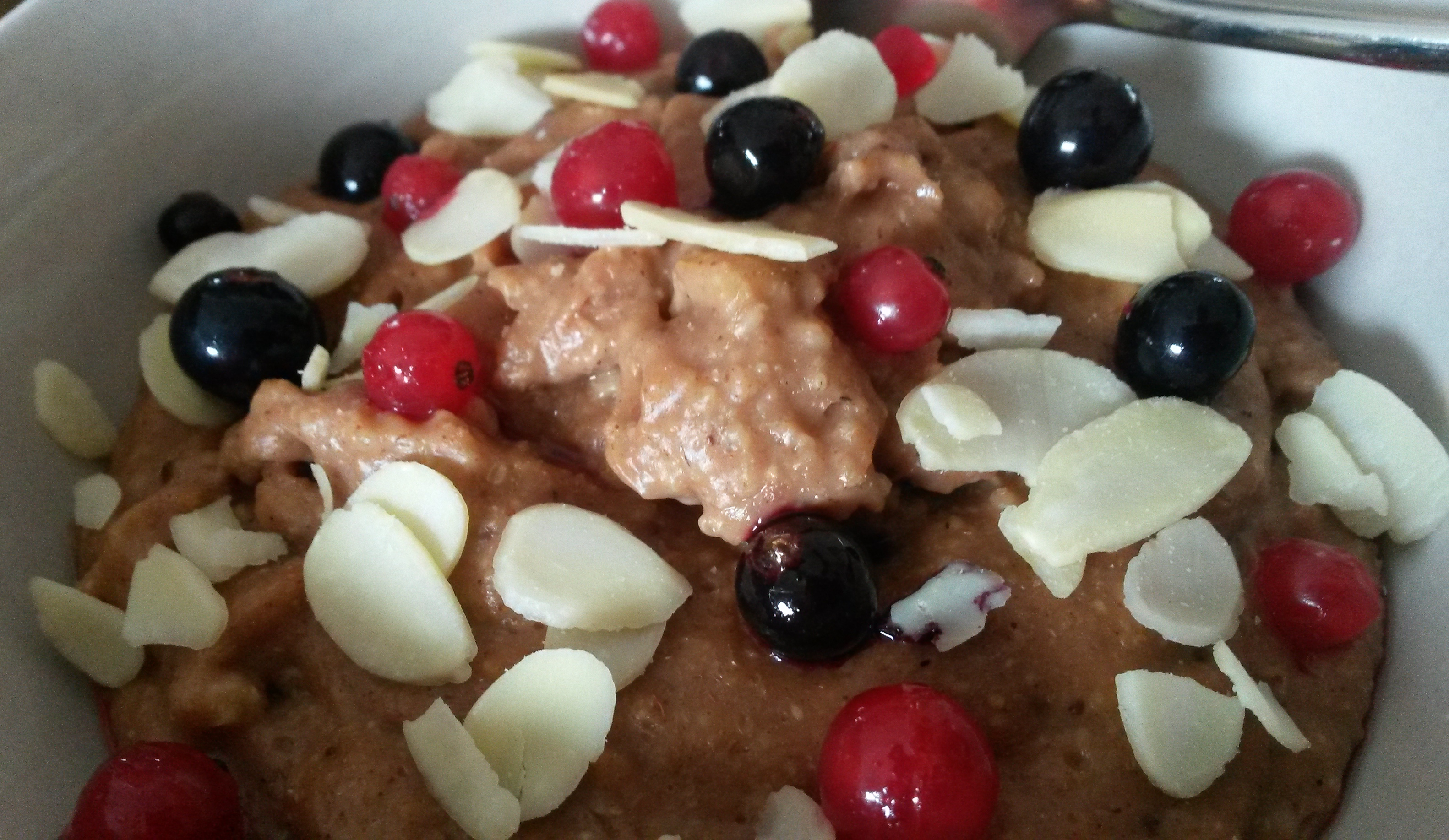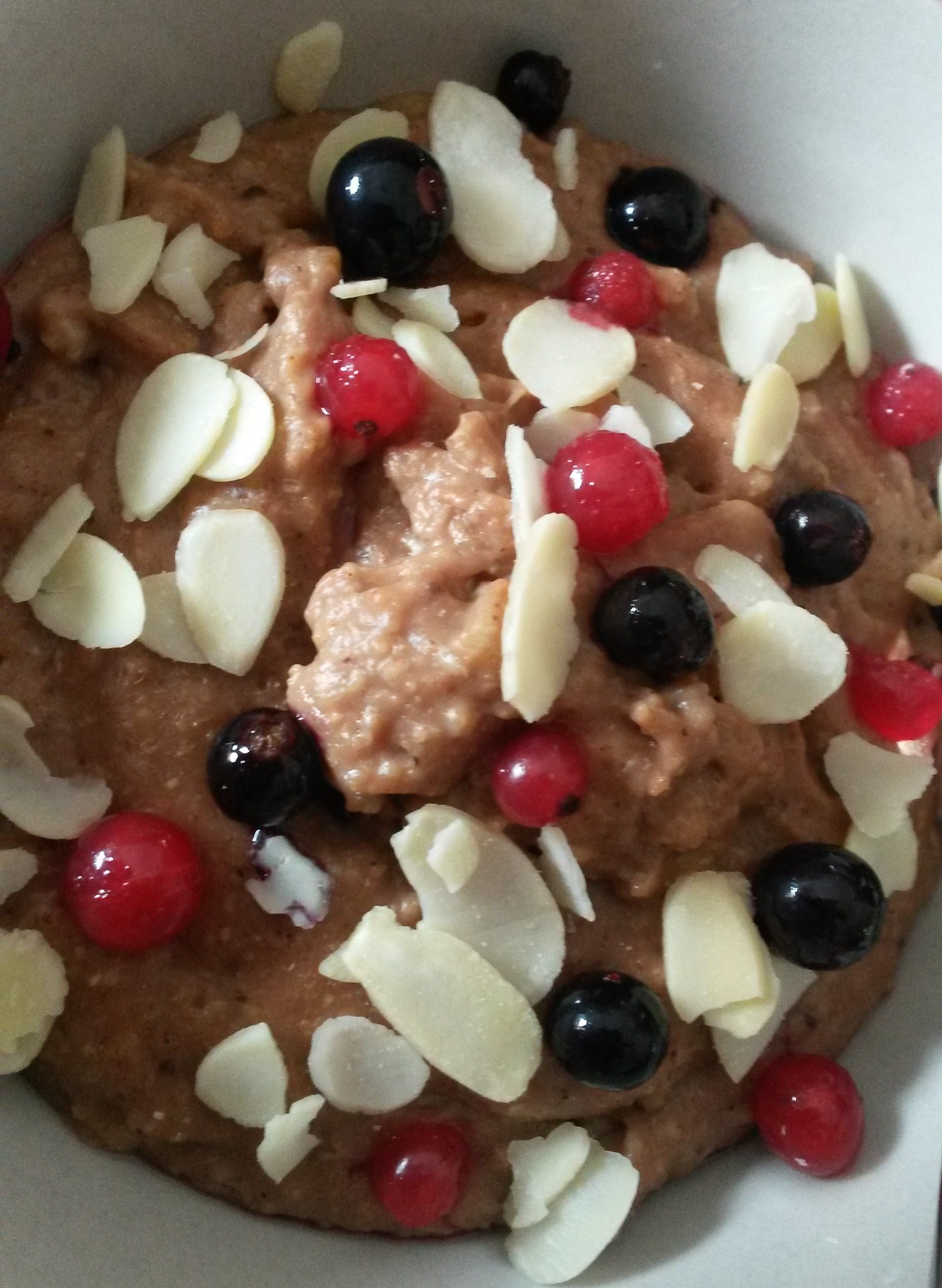 - Spoon into a bowl (or two), top with flaked almonds and berries. Add extra milk if required.