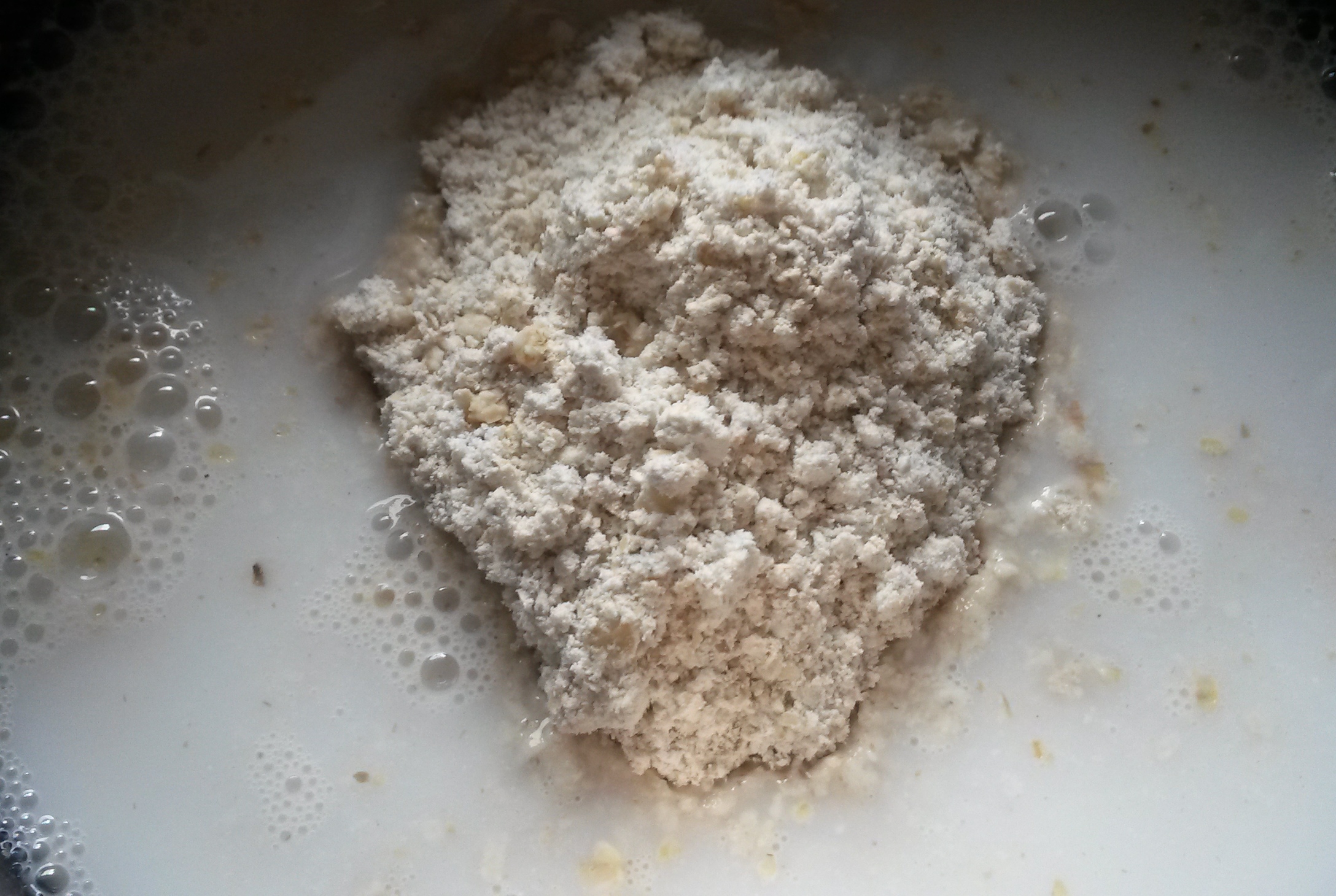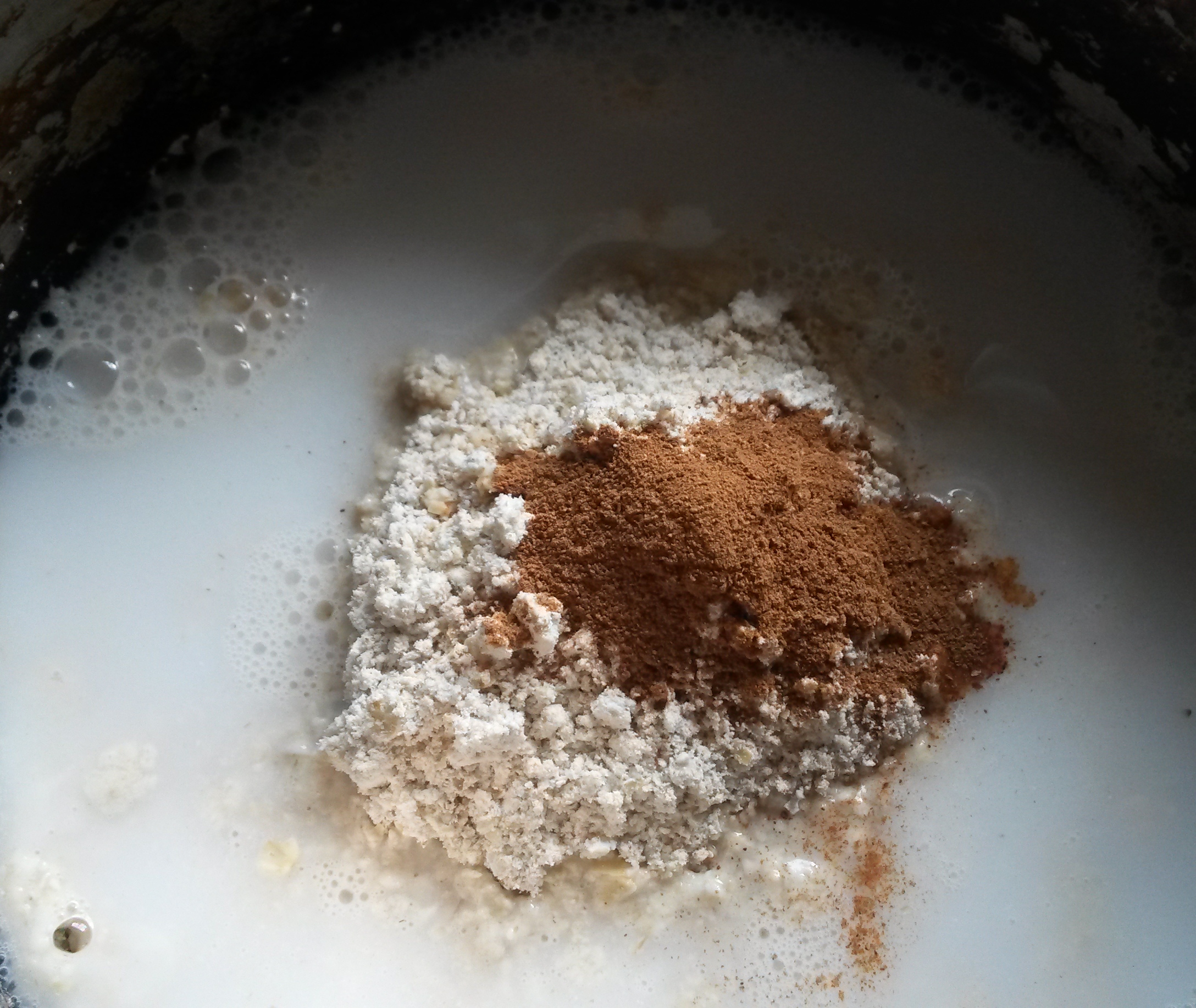 - Blitz the oats into a fine flour and place in a saucepan with approximately half (50ml) of the milk and half (75ml) of the water.