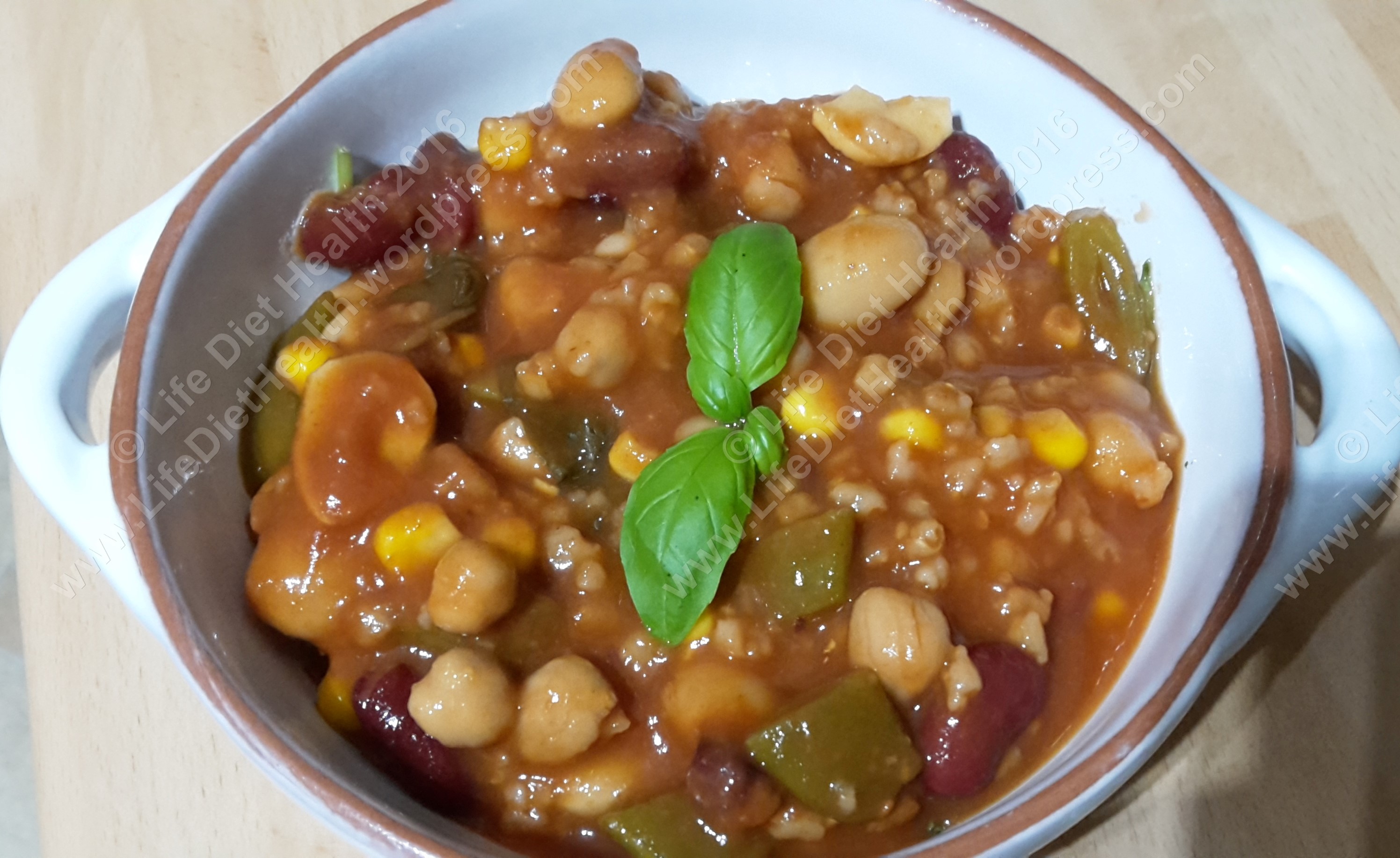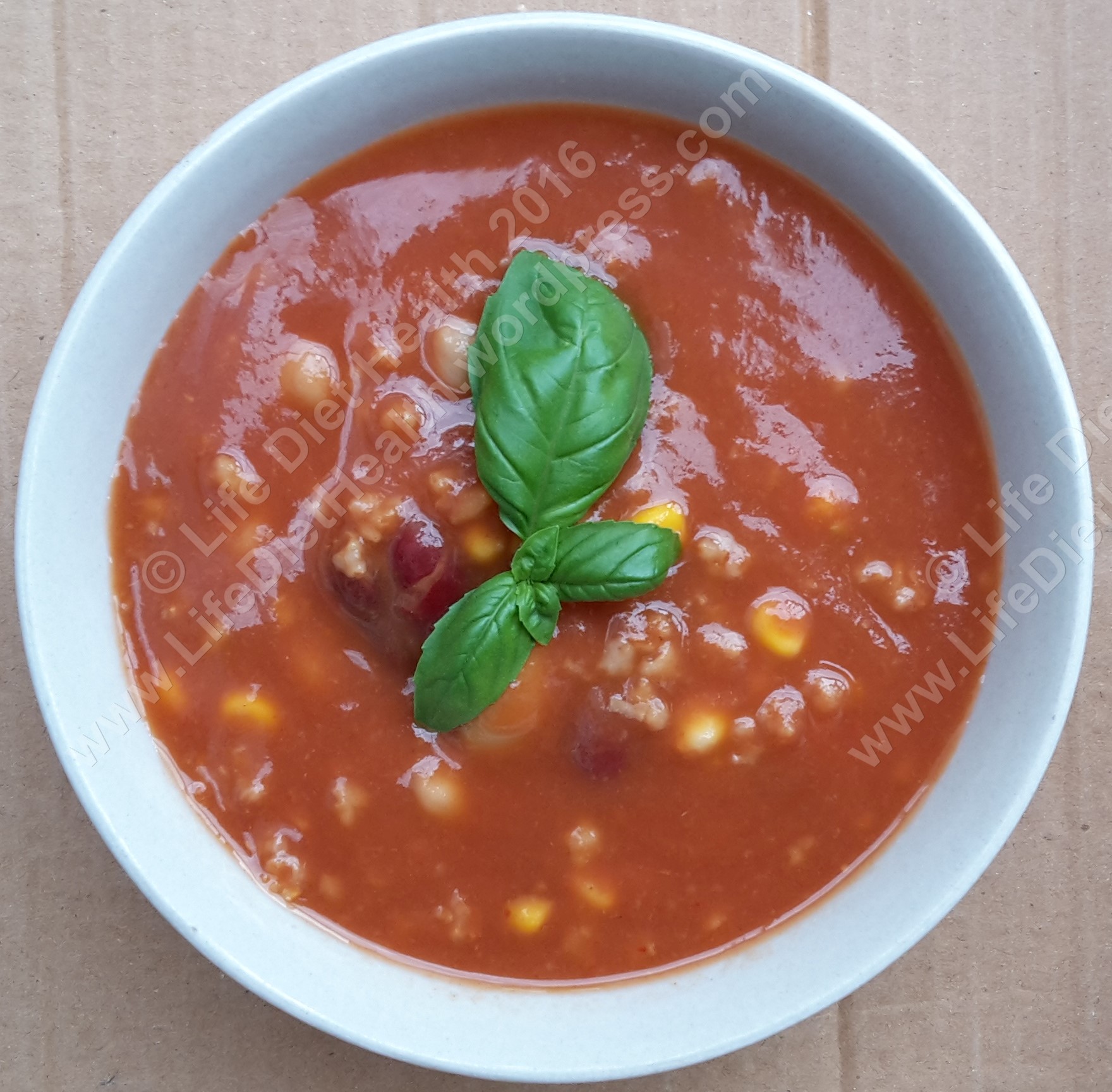 Ooo I’ve been cooking this week! SO many delicious dishes in the Life Diet Health kitchen this week I don’t know which to share with you first! The weather has changed, school is now back in full swing and Autumn is well and truly here. It is definitely soup for lunch weather and this week I’ve made a delicious hearty soup which is a meal in itself. We had it for a filling lunch but it could easily pass for an easy dinner too. This soup is full of protein with an array of different pulses, a handful of vegetables for added vitamins, all bound together in a luscious bold tomato and basil base. Perfect!
