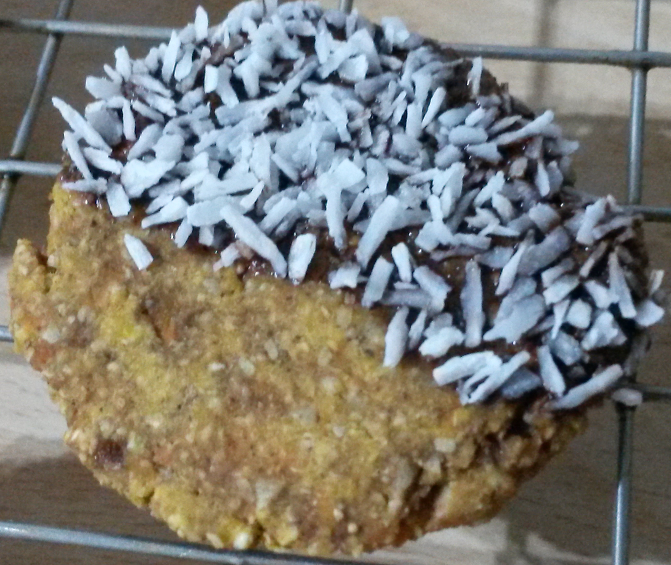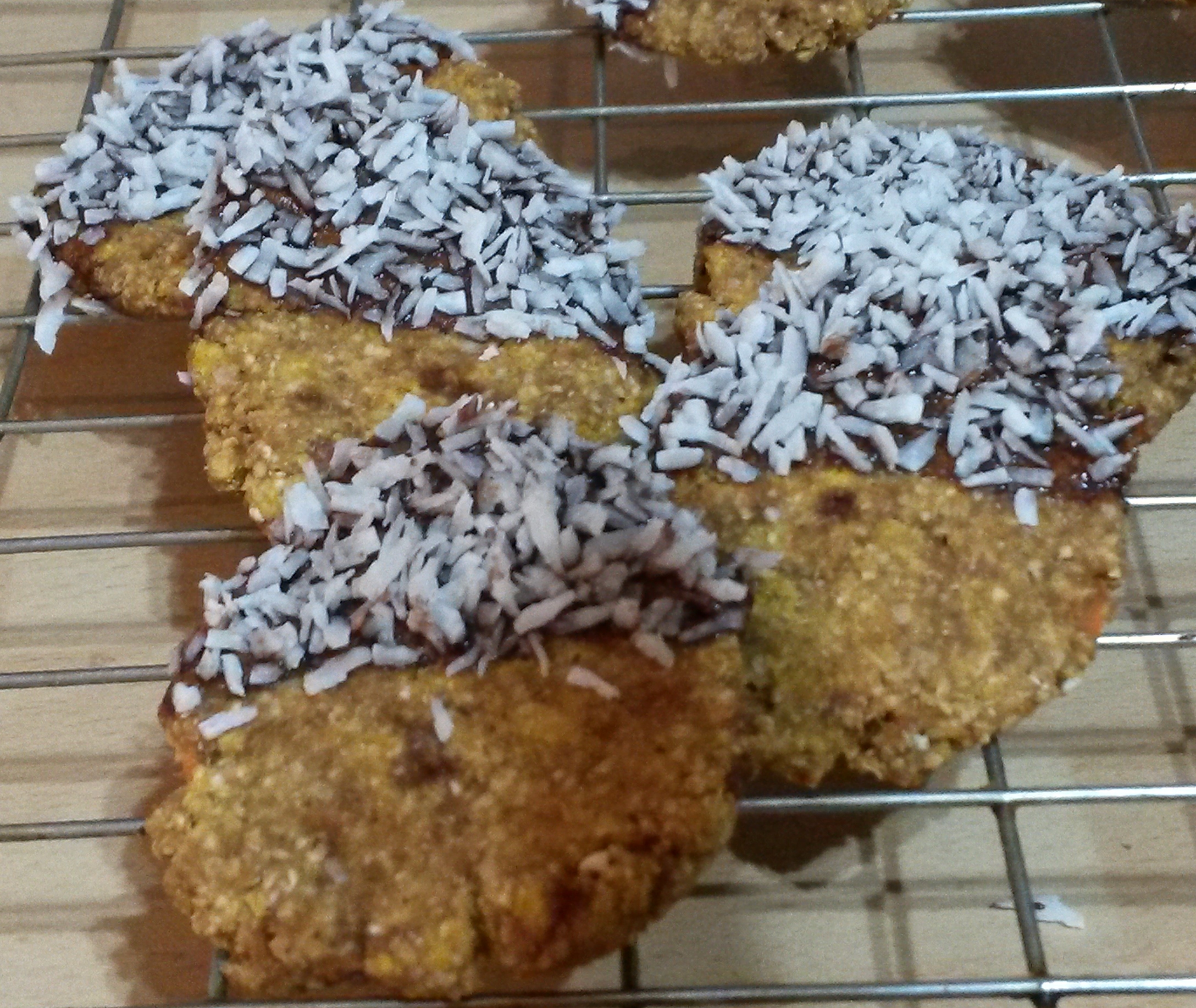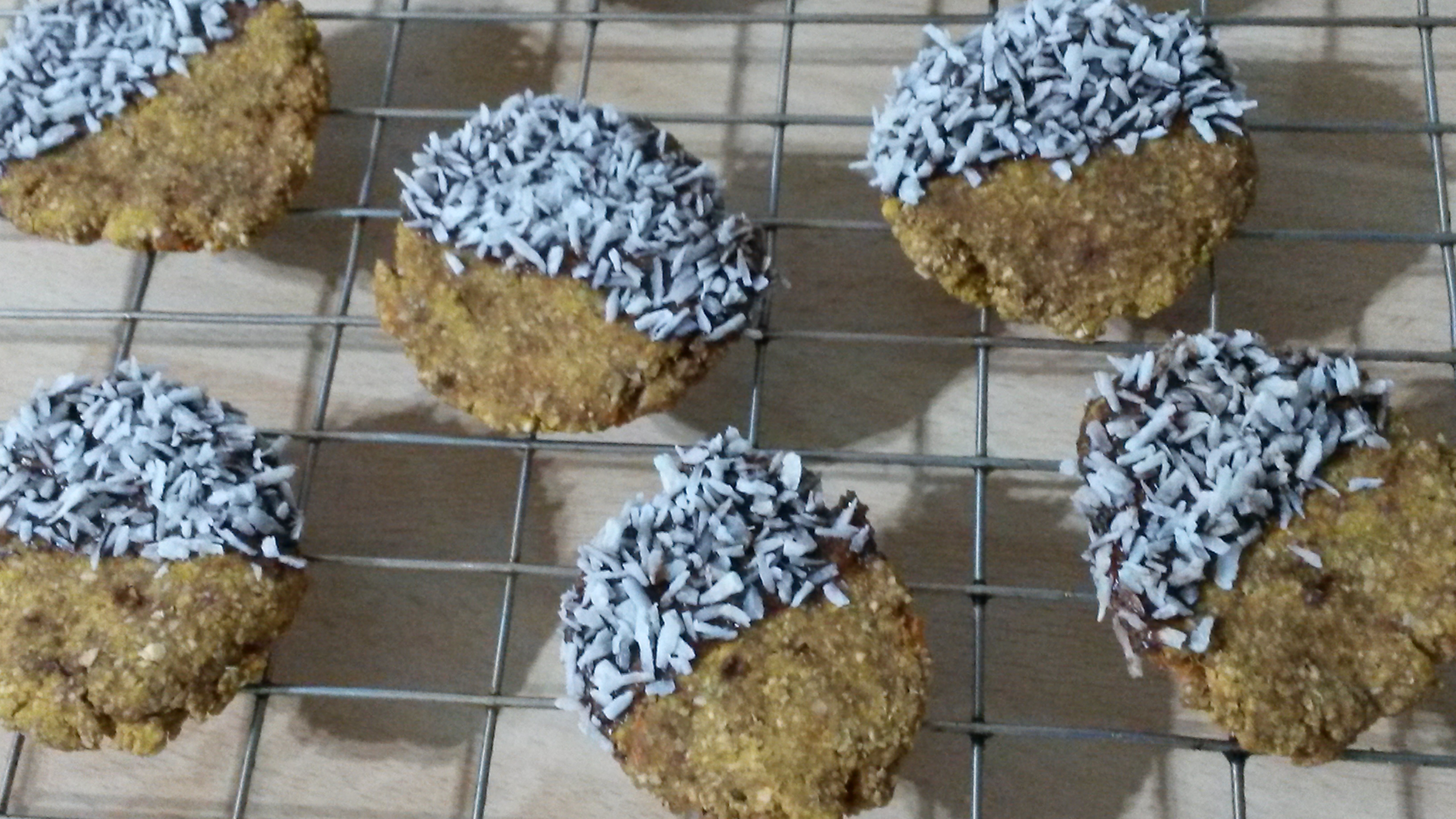 - Optional dipping: Melt the coconut oil, stir in the agave and cacao. Dip / drizzle half of the biscuit with the chocolate mix then sprinkle with coconut. Allow to dry.