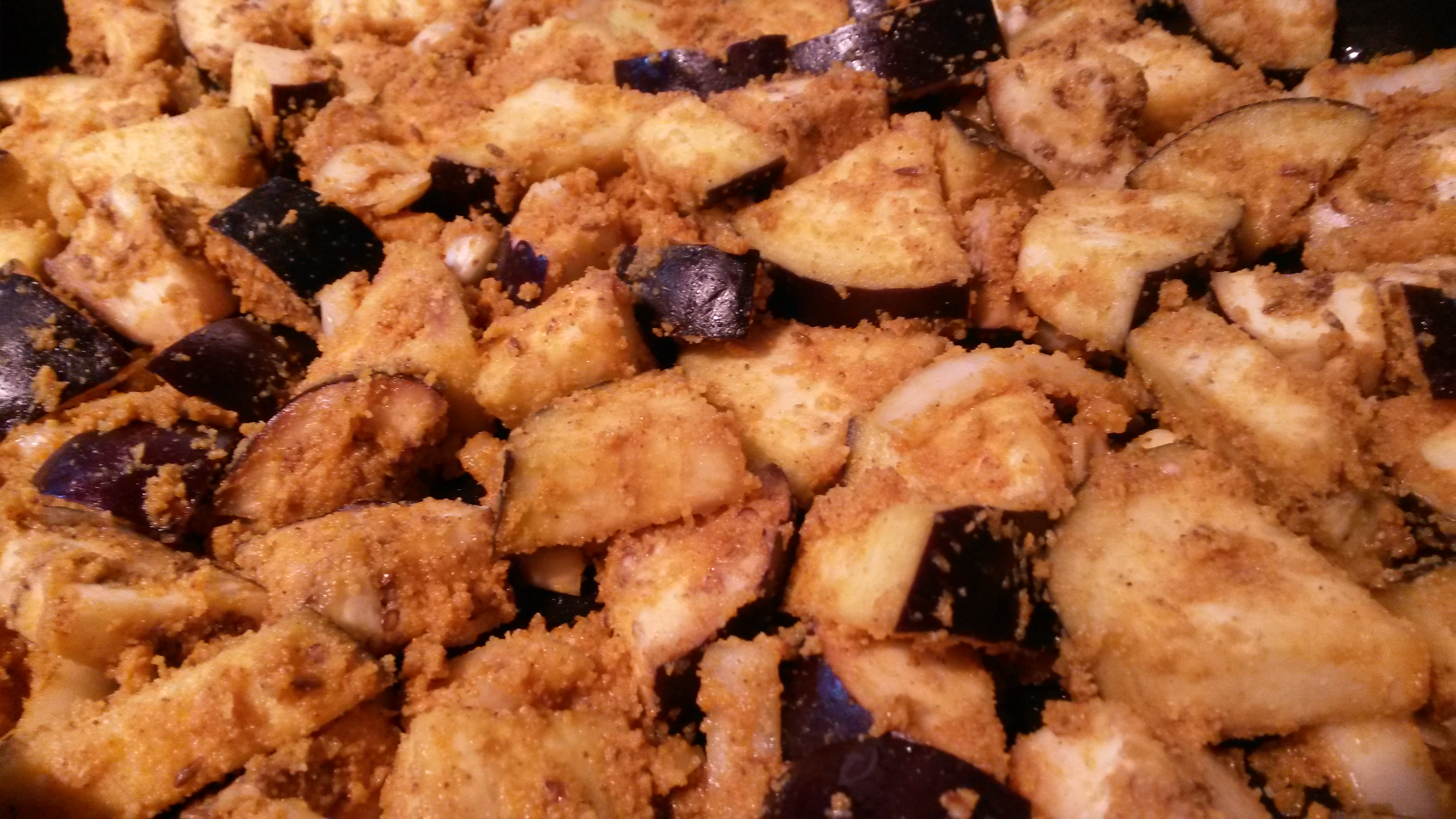 - Using a spoon (otherwise you’ll smell of curry for ages), coat all of the aubergine with the mixture.