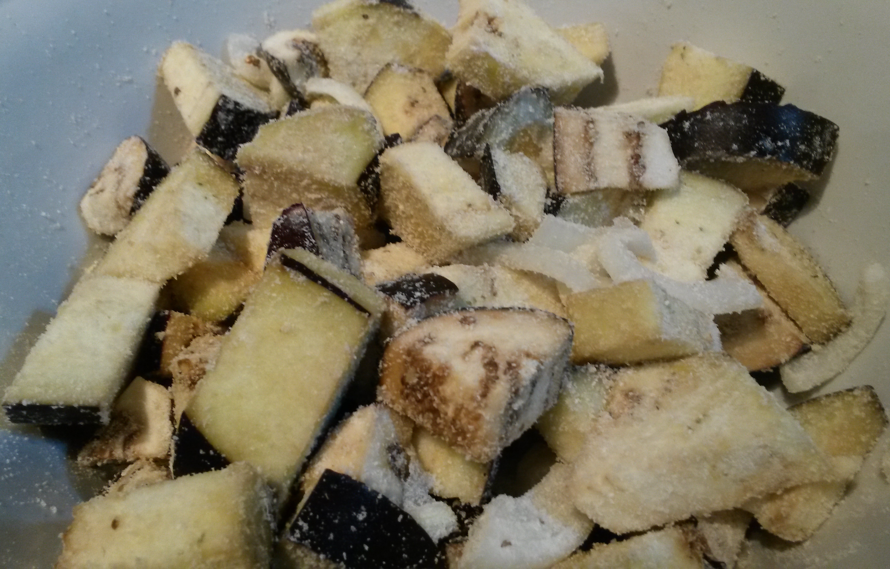 - Add the flour and salt and using your fingers, mix it all in so all the aubergine is coated and there is no loose flour.