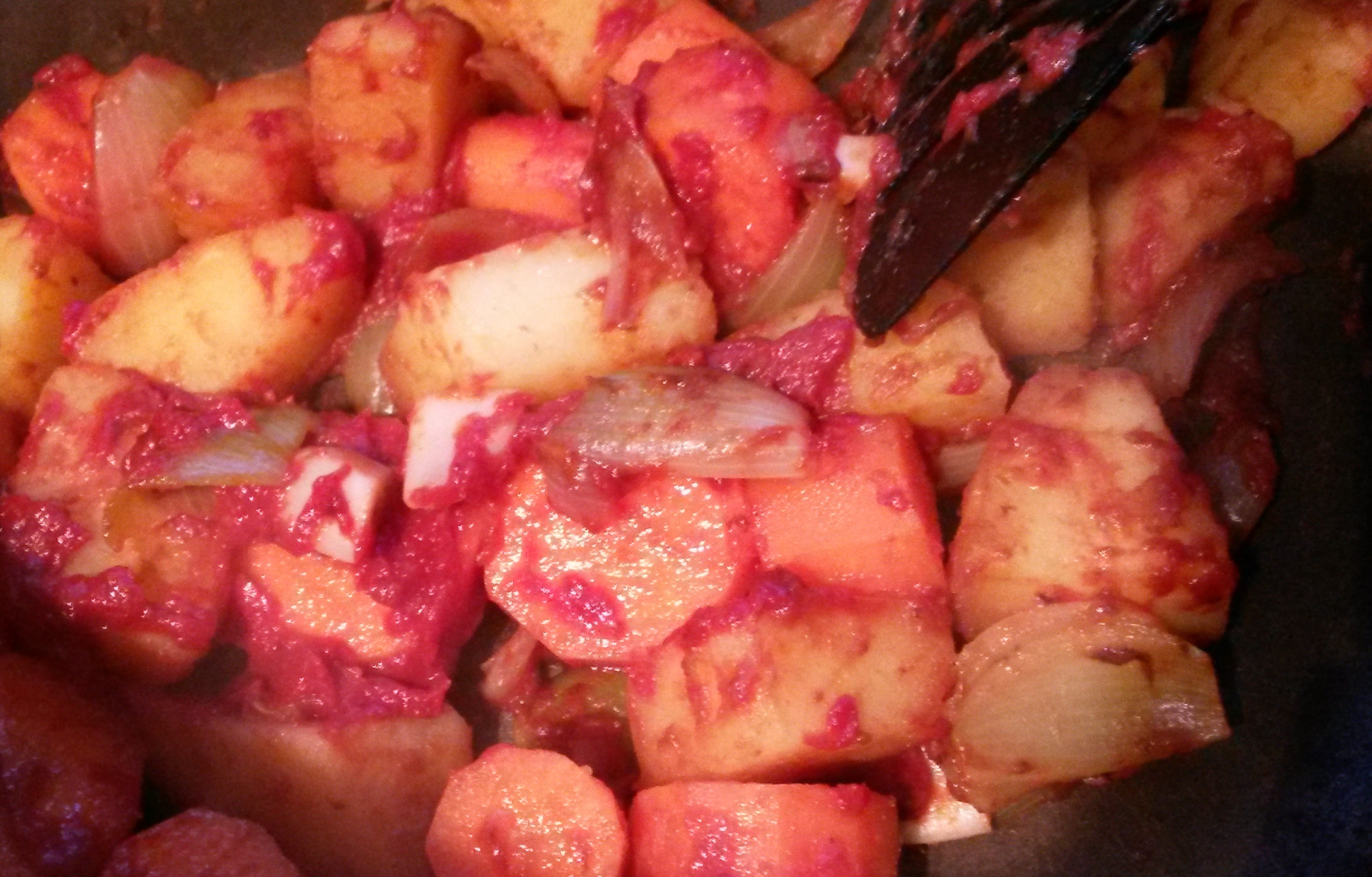- Add the carrots, then add the tomato puree and cook for a minute stirring continuously.