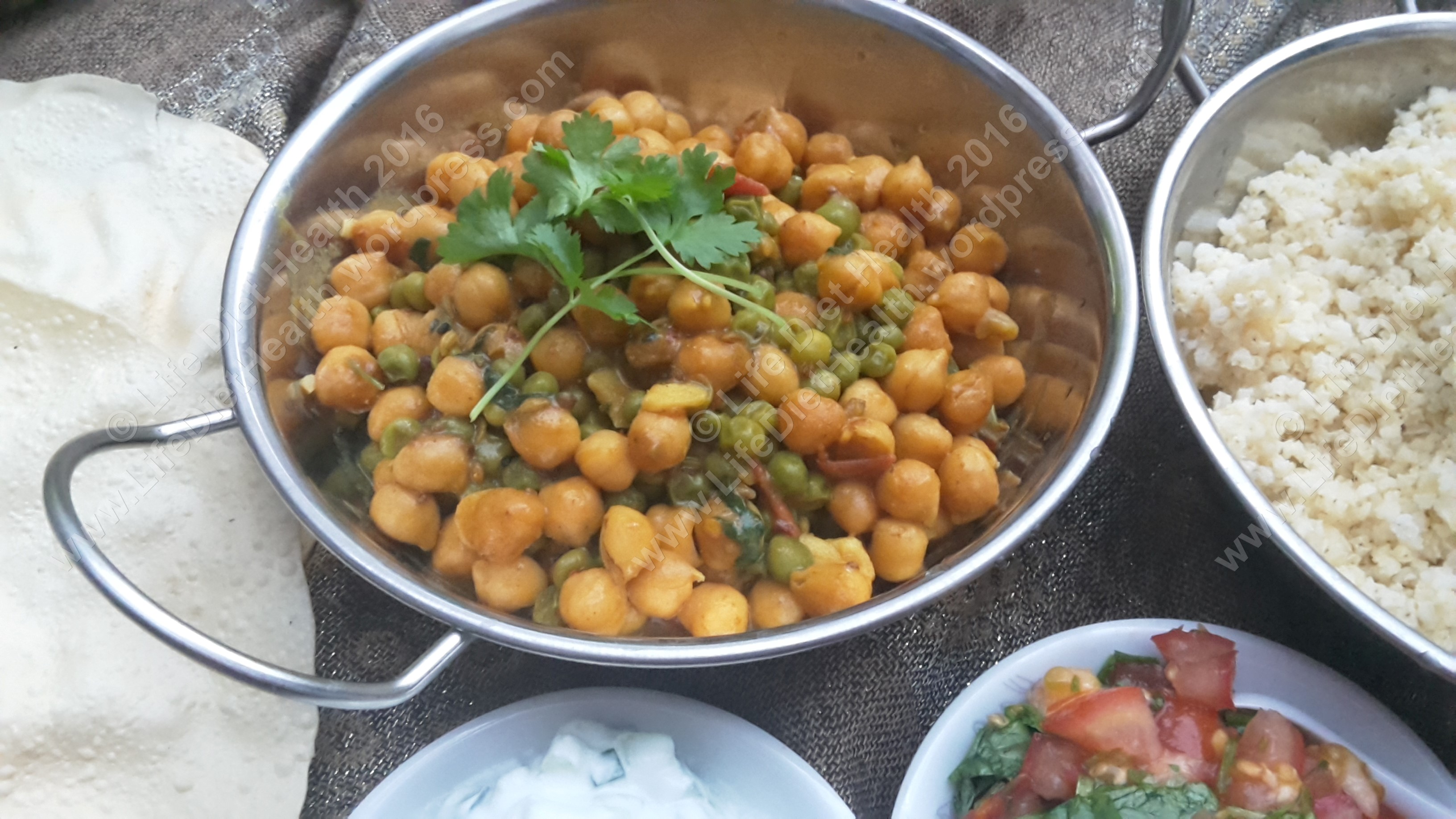 Do you like the name! 😛 Well, I could call it a chickpea curry but then the garden peas might feel left out! I thought of calling it double pea curry, ooo or two-pea curry 😛 But I like pea-pea best! As you have probably guessed, this curry is made with chickpeas and green garden peas. I would usually just do a chickpea curry, but I thought I’d try adding some colour to it and the taste and the textures really worked well together. Hooray! I even made some raita to go with this – a lovely cooling cucumber and mint bound in coconut yogurt 🙂 delicious!