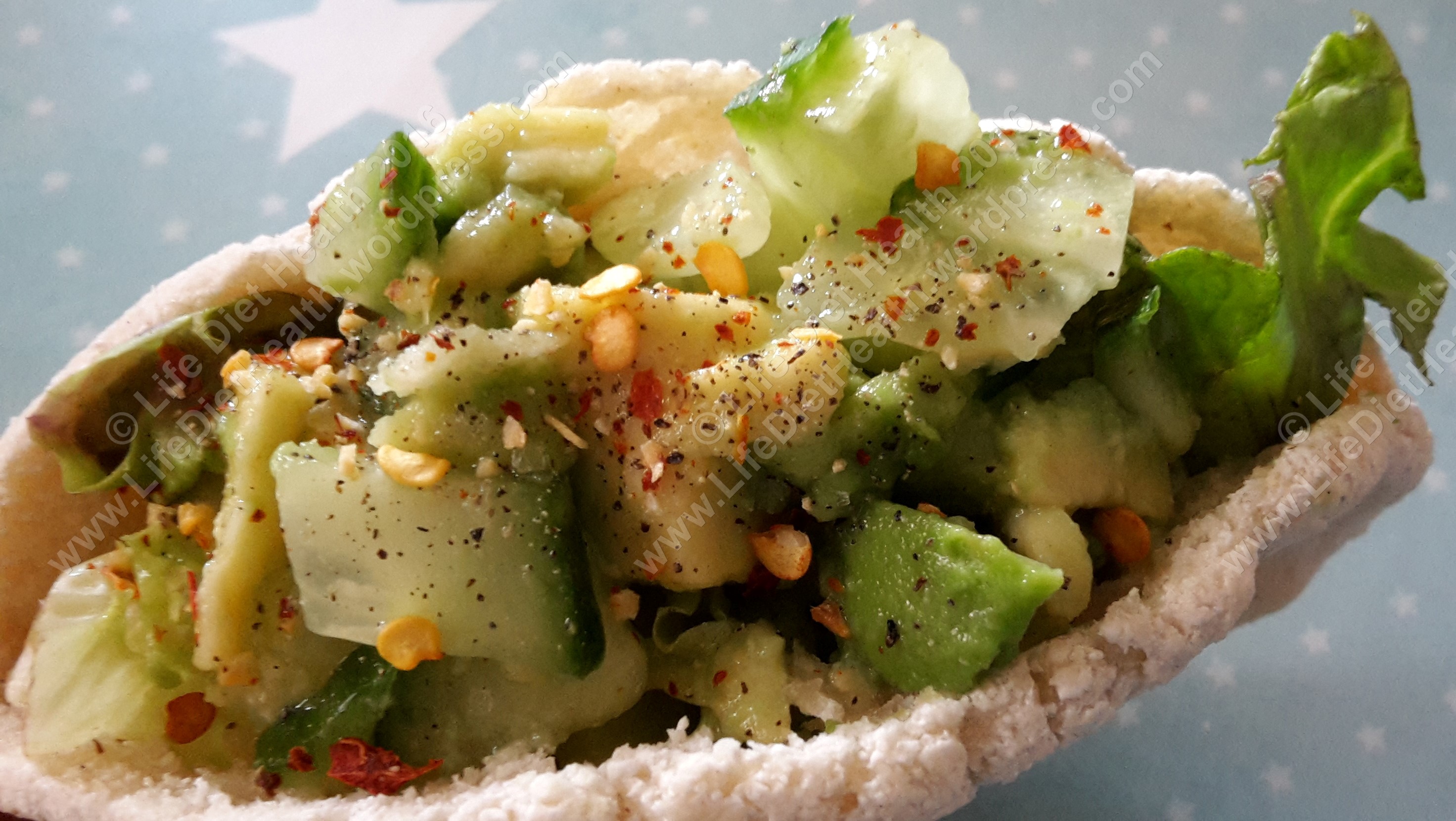 - Make a delicious avocado pitta by mixing diced avocado with cucumber, tomato, chili flakes, ground black pepper, salt and a splash of lime juice.