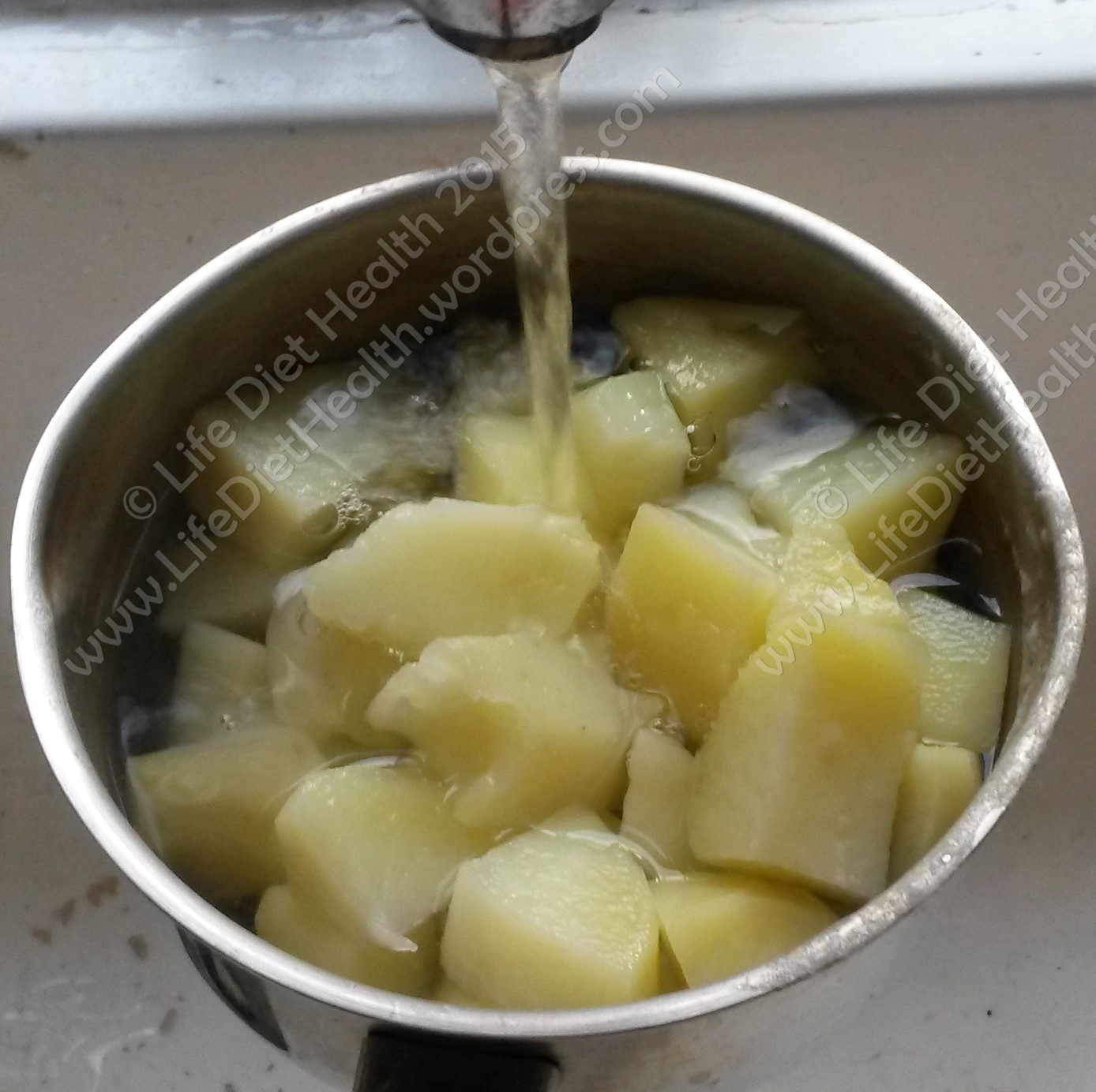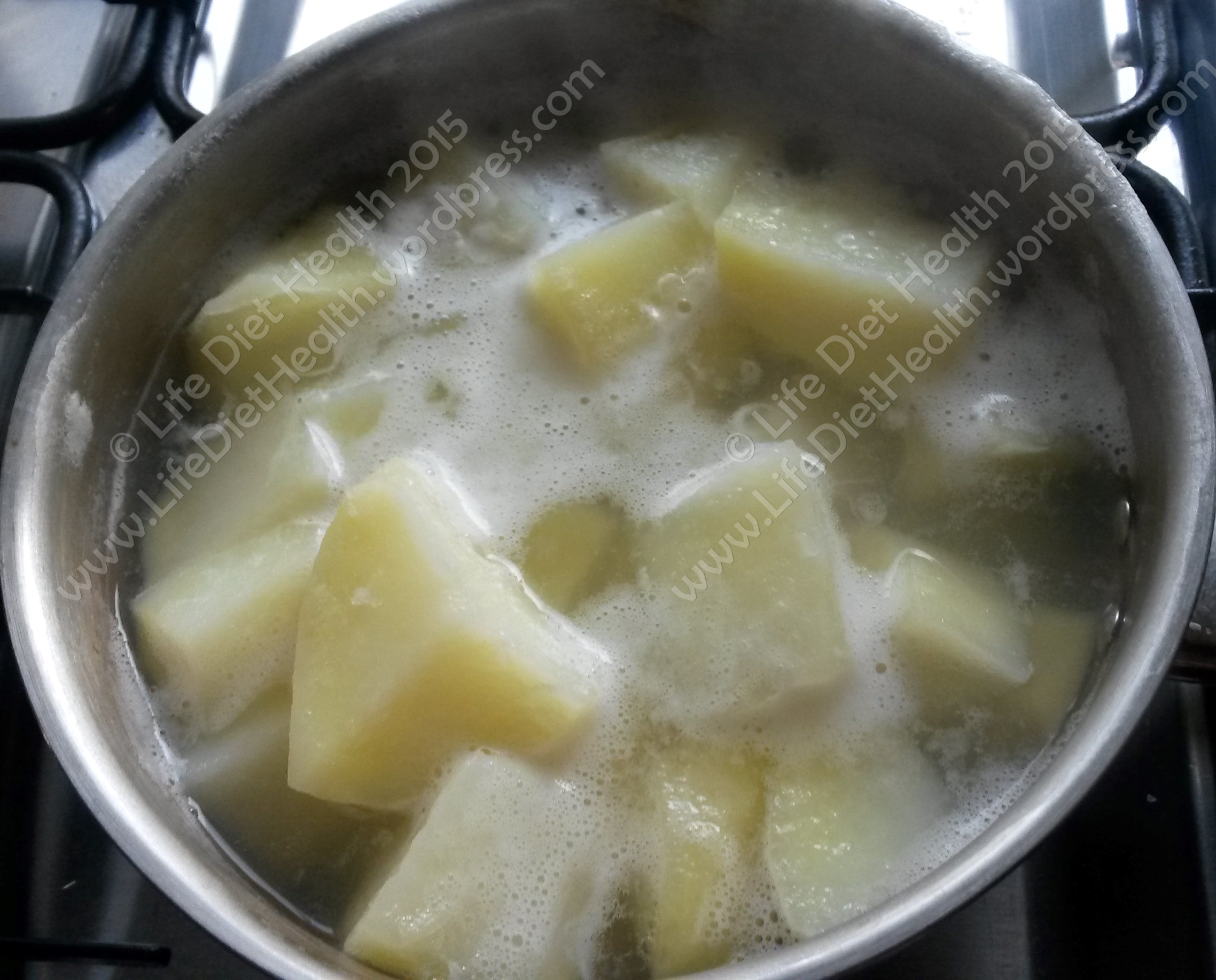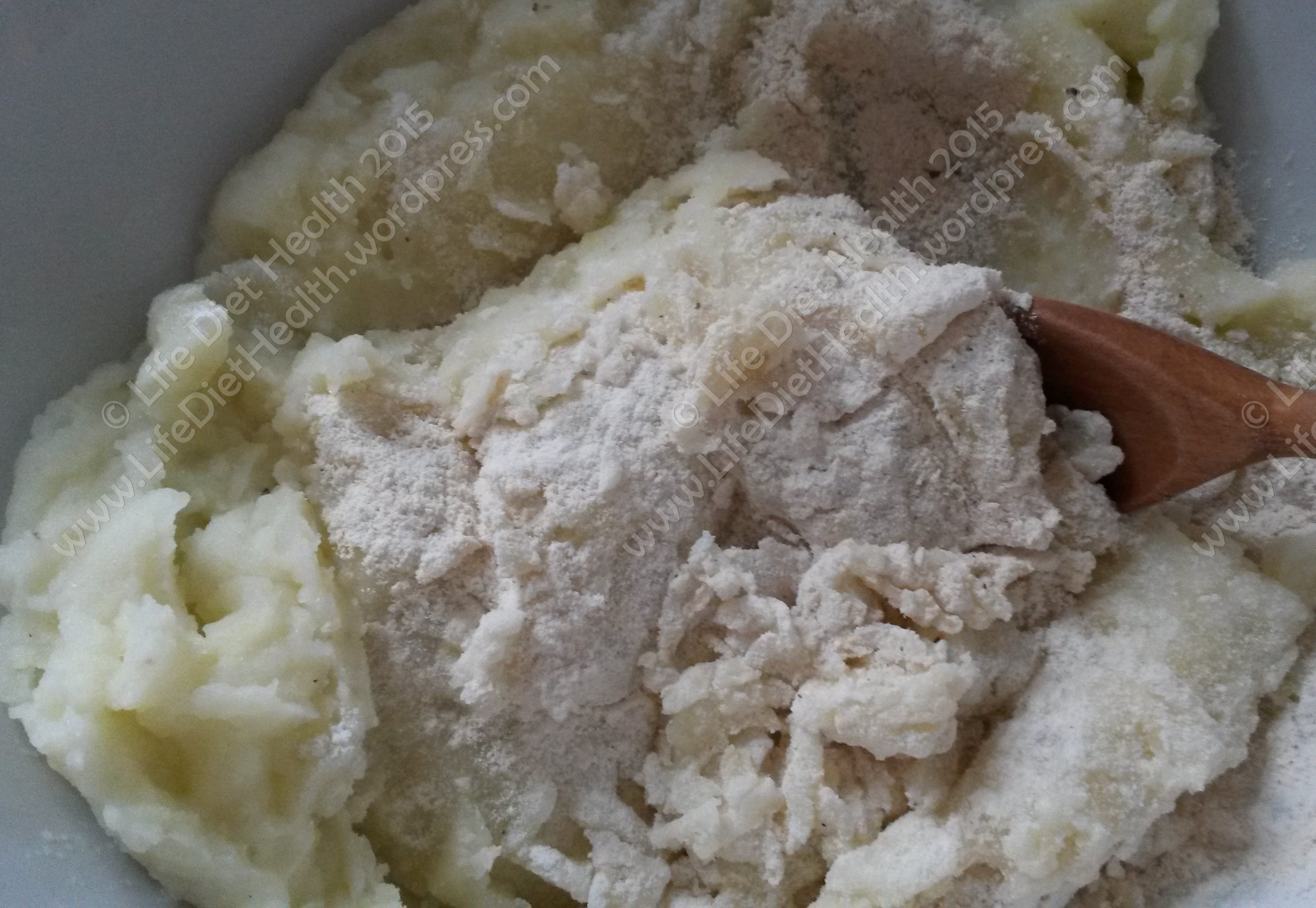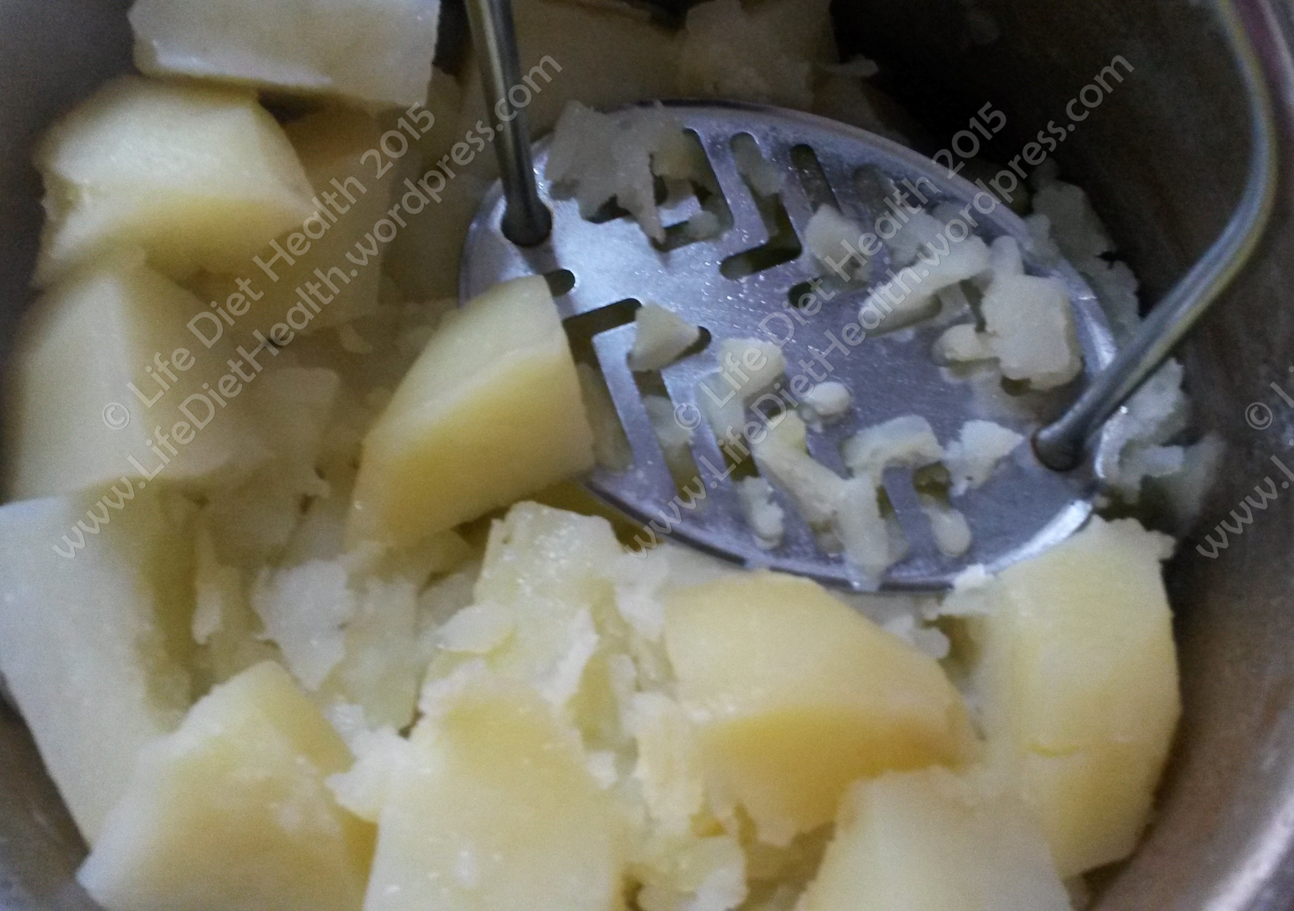 - Mash the potatoes until smooth then add the milk (if the potatoes are still warm, warm the milk before adding).
