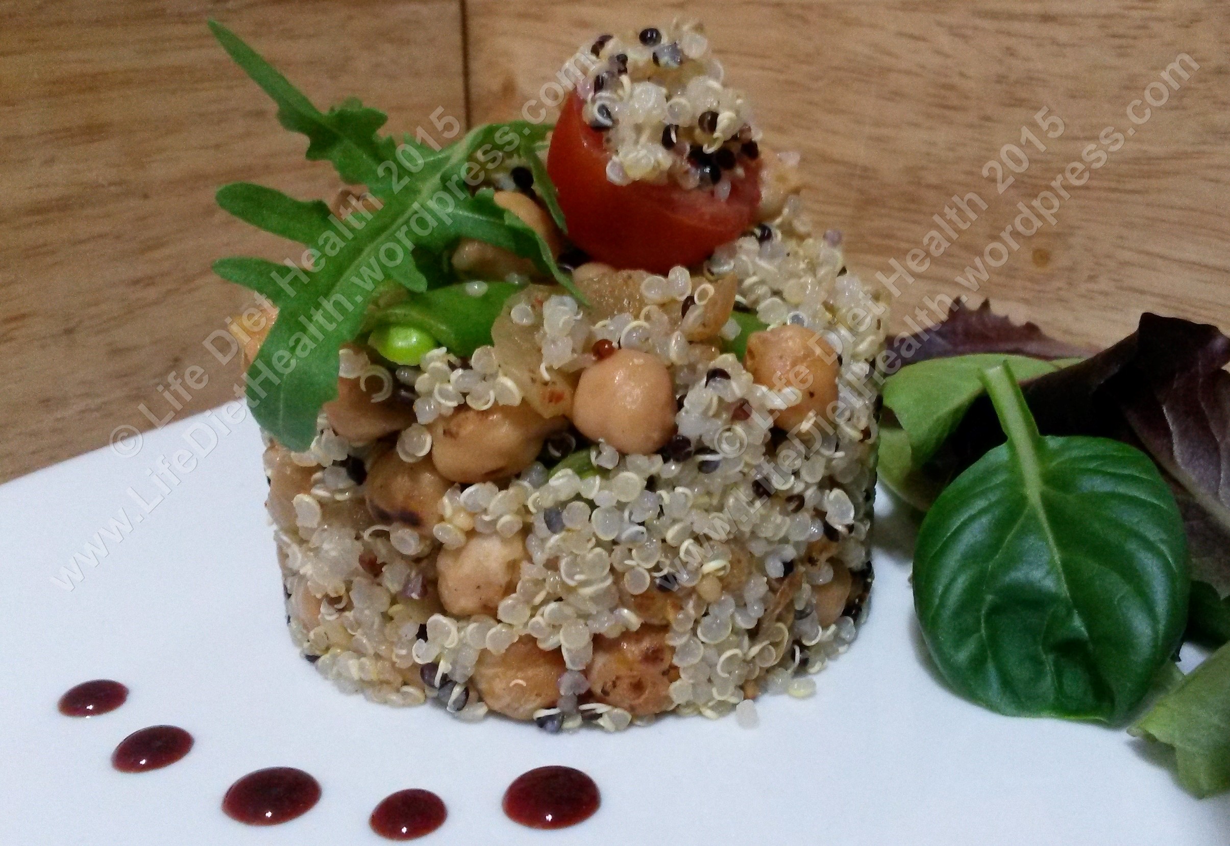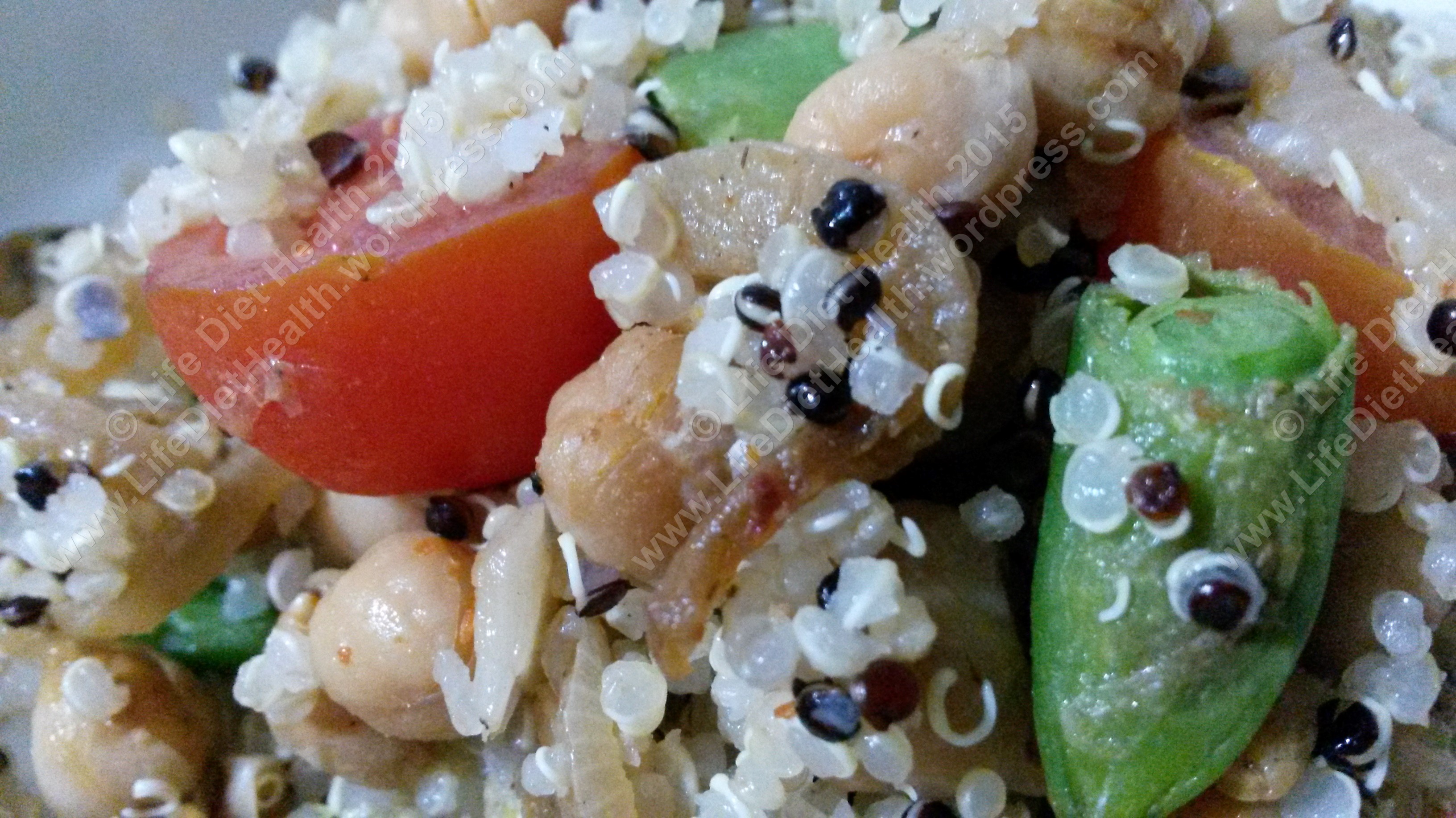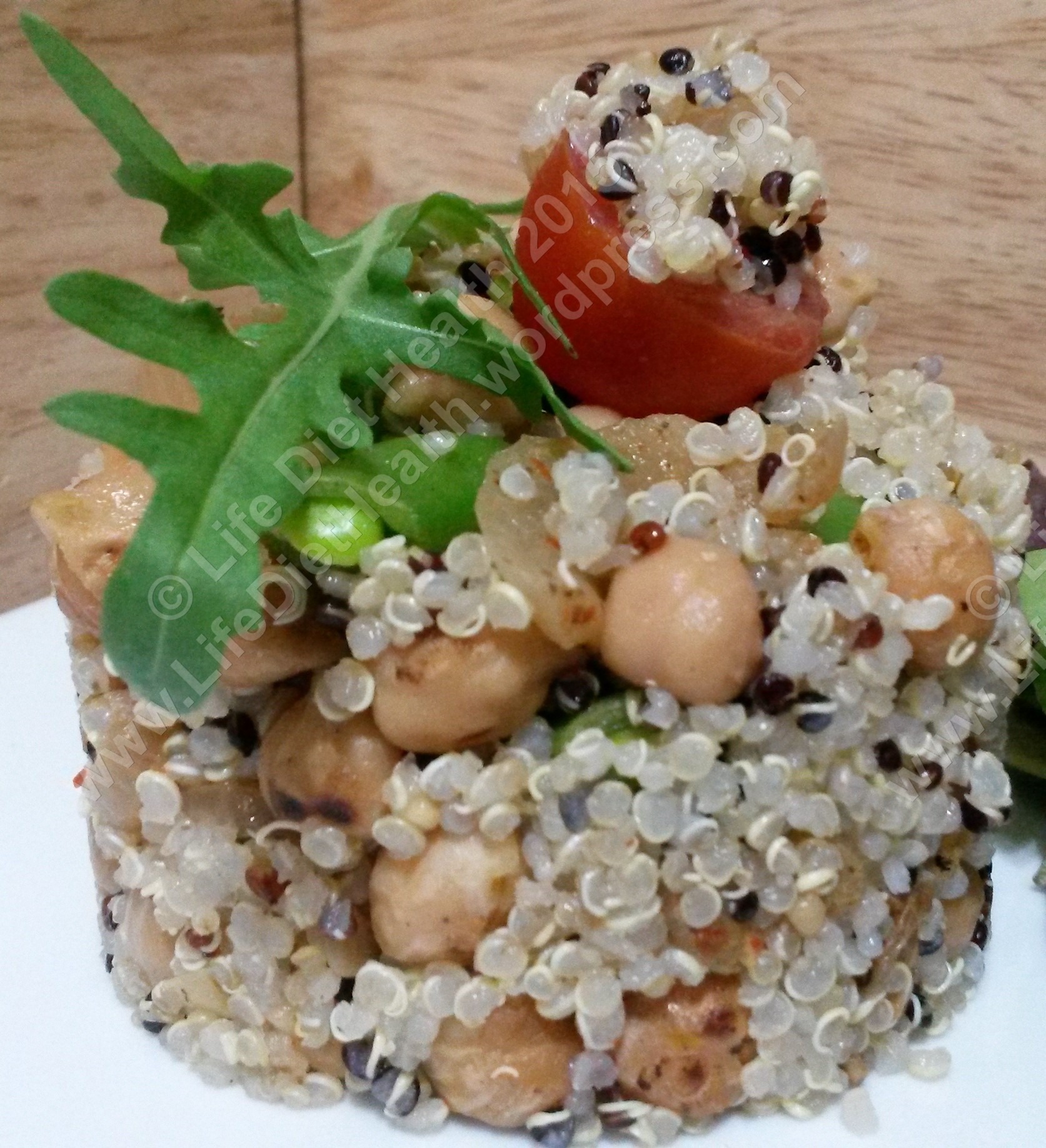 - Add the cooked quinoa to the chick peas and season to taste with salt.