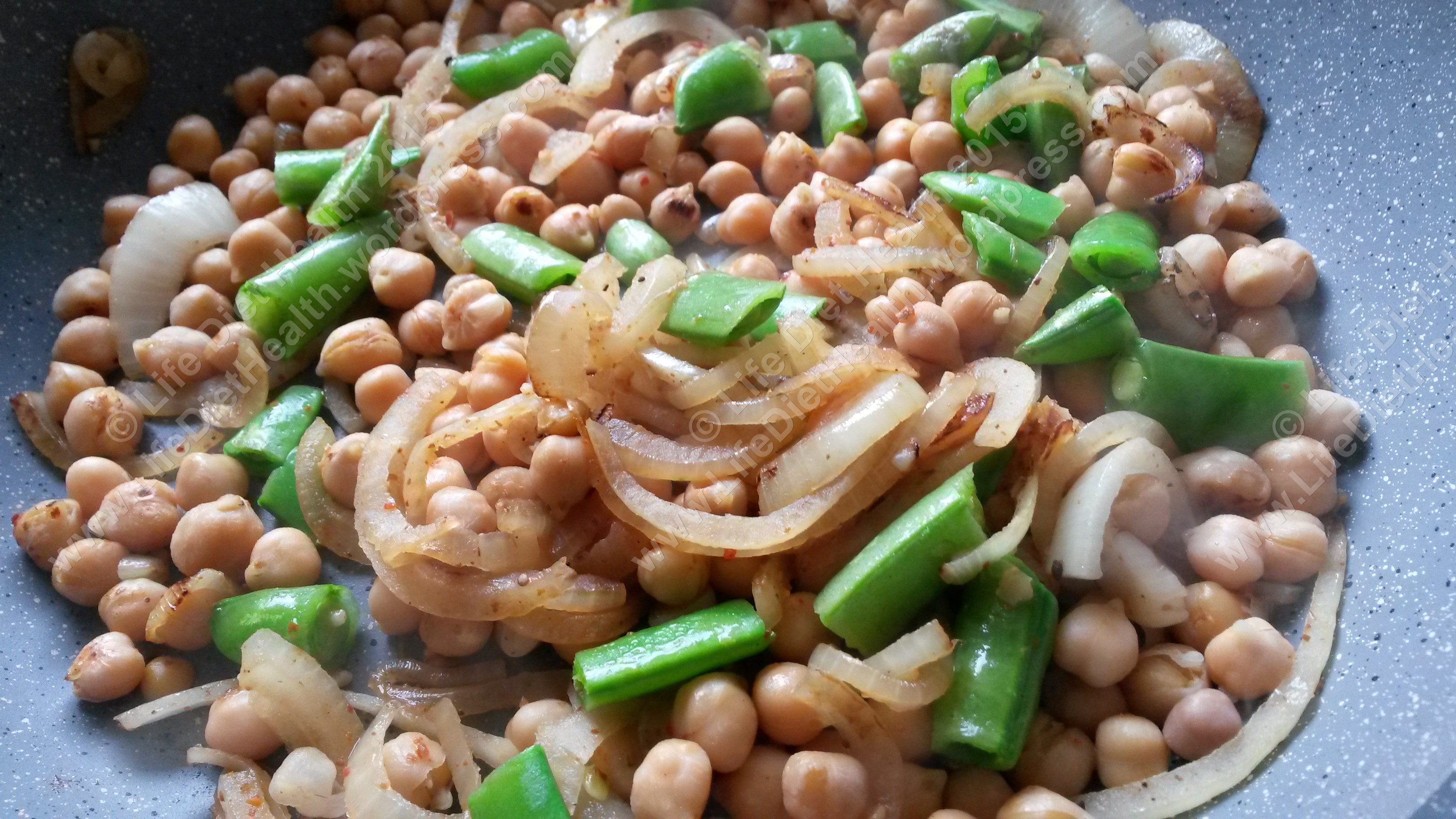 - Add the sugar-snap peas and cook for 2-3 minutes.