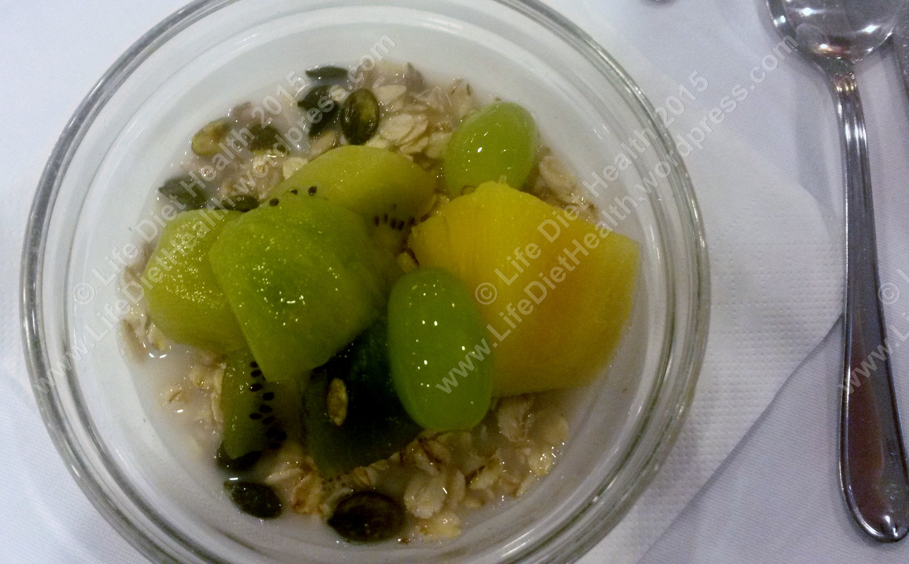 Yes, vegetables for breakfast! It wasn’t the only choice of course but I didn’t want cheese or ham, neither did I want fried eggs and sausage! Fresh fruit yes please and salad? Well, I had tomatoes and cucumber but even I could not stomach lettuce, carrot and sweetcorn first thing! This doesn’t look like the healthiest option but it was so tasty and kept me full up until dinner! That is dinner 1800h, not dinner lunchtime at 1200h! 😛 🙂 Oh.. maybe the oats helped?! No idea what they do to their oats here because I’m sure at home I wouldn’t entertain the idea of putting milk on raw oats and eating them! Oh, and get this! Not only is there soya milk for breakfast, there is also rice milk or oat milk! Wow!