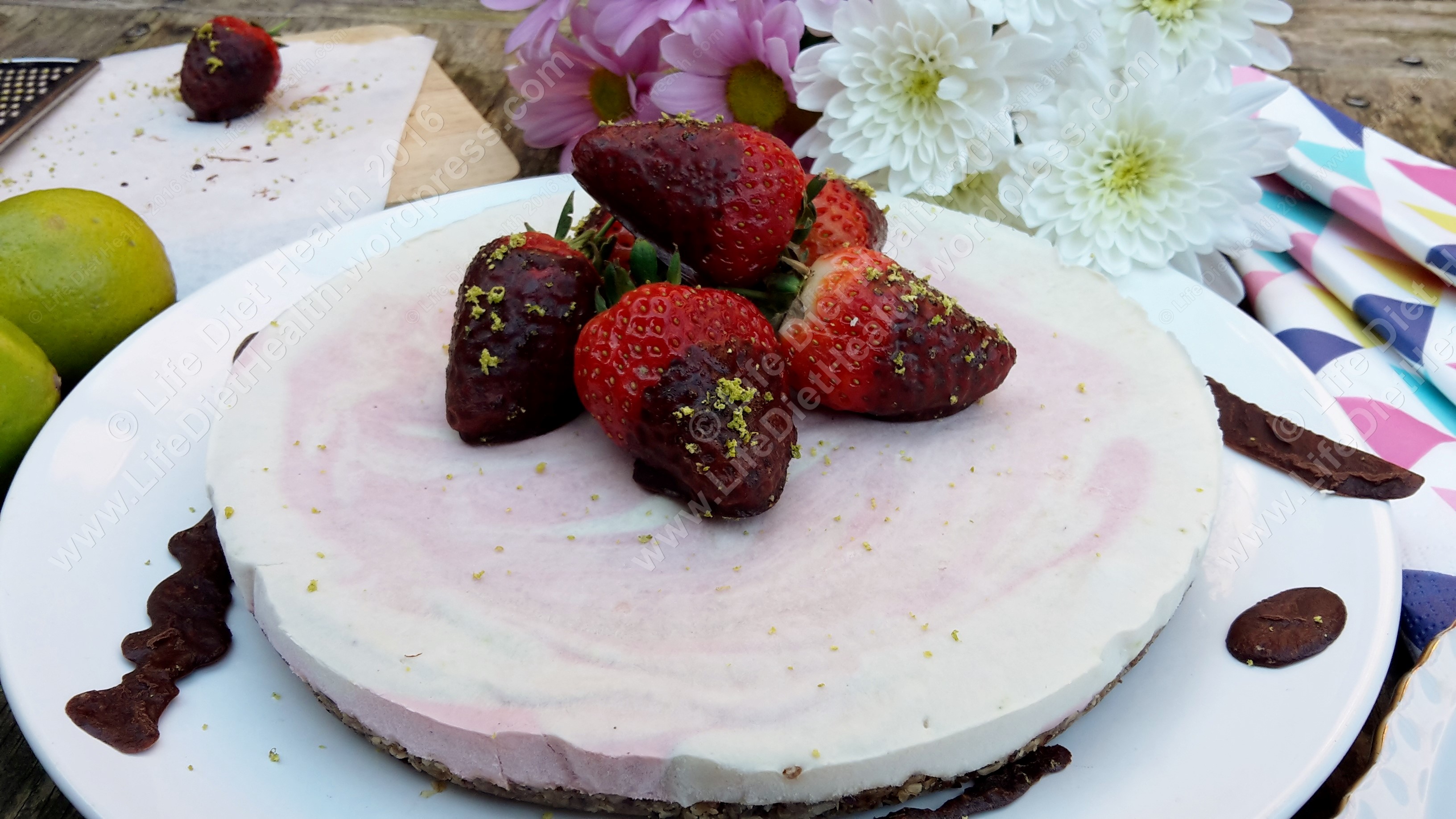 - Dip strawberries in melted (raw) chocolate and sprinkle with lime zest.